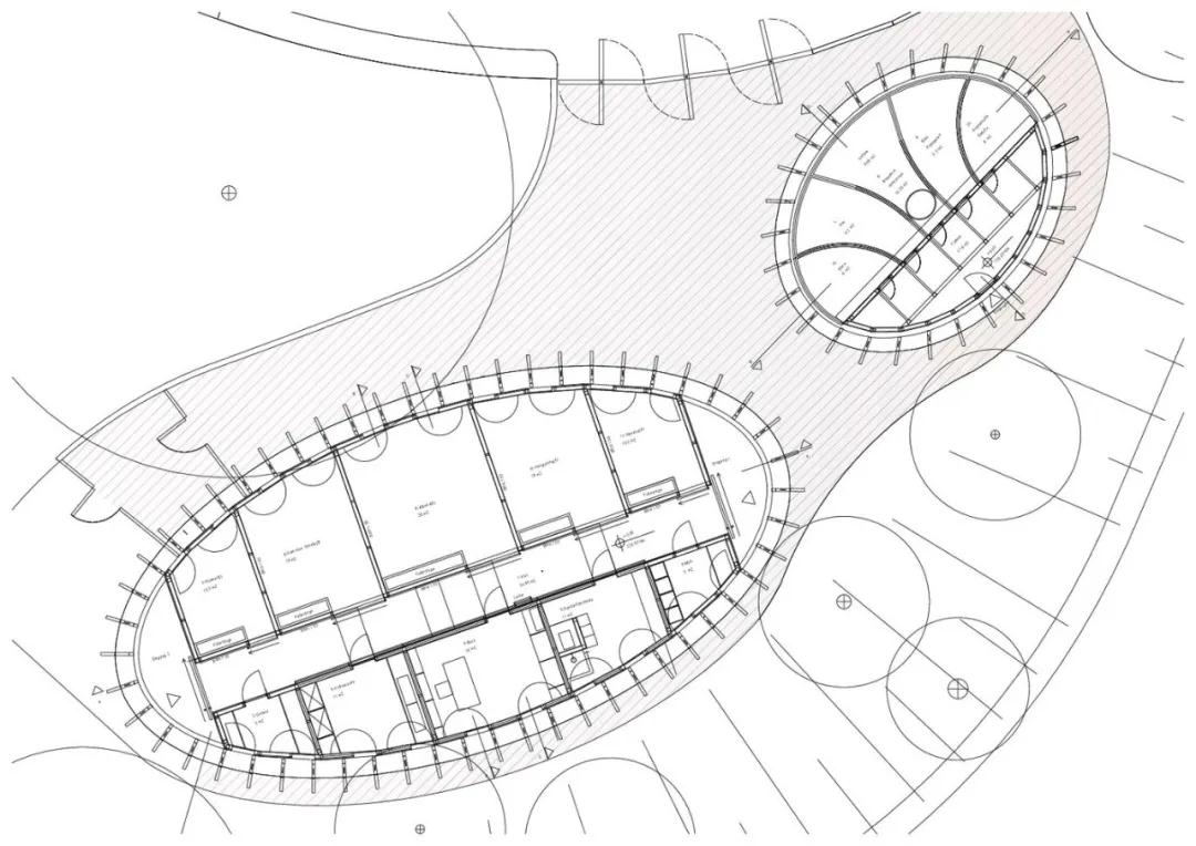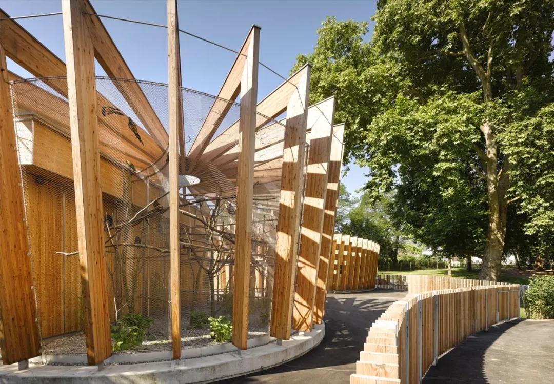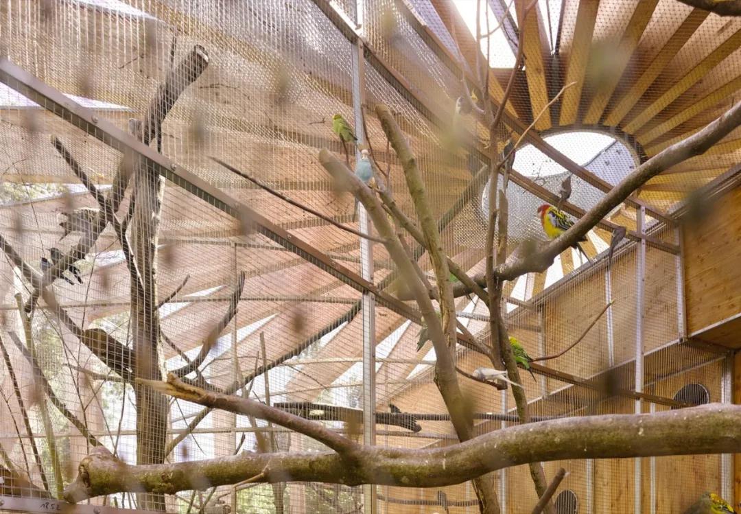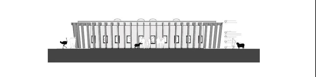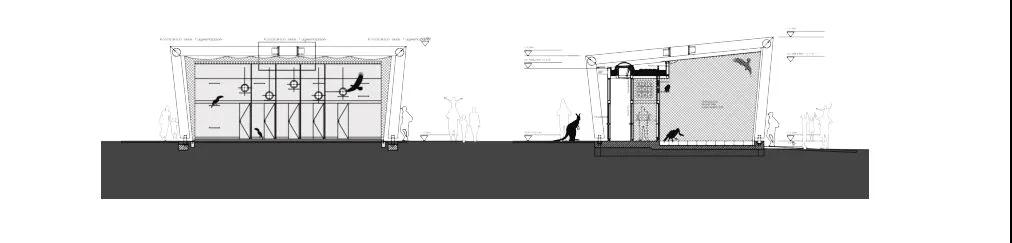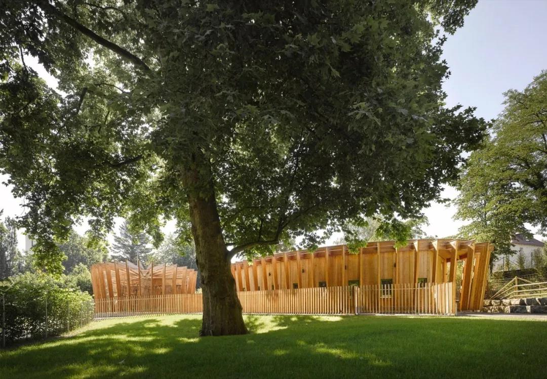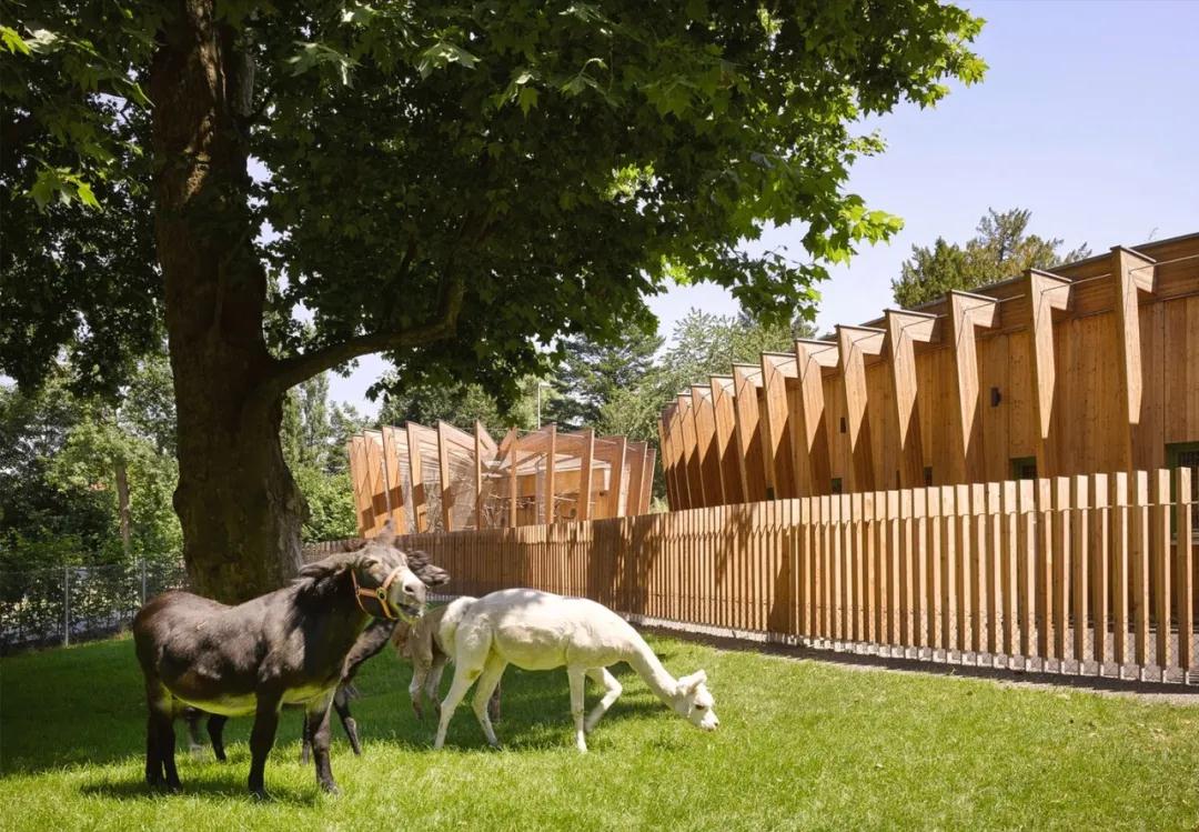 以這種方式,這三個(gè)元素在整體上非常顯眼,但在自然環(huán)境中仍然顯得細膩。此外,鳥(niǎo)舍和馬舍的層狀外觀(guān)增強了這種生動(dòng)的效果,使整體具有更高的復雜性和深度。此外,建筑物的吸引力根據兒童的視線(xiàn)高度調整,應成為參觀(guān)和消磨時(shí)光的誘人場(chǎng)所。