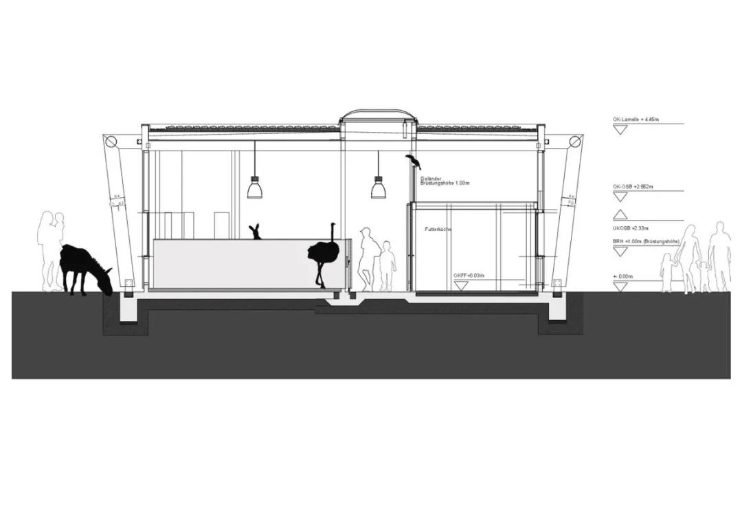 合奏的形式形狀與它的特殊用途以及它的城市背景強烈地相互作用。位于“ Schlossgarten”南部和池塘附近的裸露場(chǎng)地使兩體積的建筑物連同圍欄可以輕松運輸。還為步行經(jīng)過(guò)的人們,尤其是對動(dòng)物園的小游客提供了全方位的多重視野。