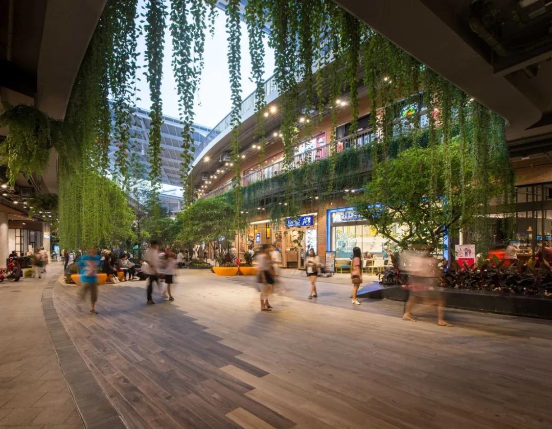 在環(huán)境上關(guān)注風(fēng)、濕度、溫度、日照等生態(tài)要素,設置雨洪管理系統,有針對性的物理調節,改善區域微氣候,為人們創(chuàng )造一個(gè)更加生態(tài)舒適的商業(yè)街空間。