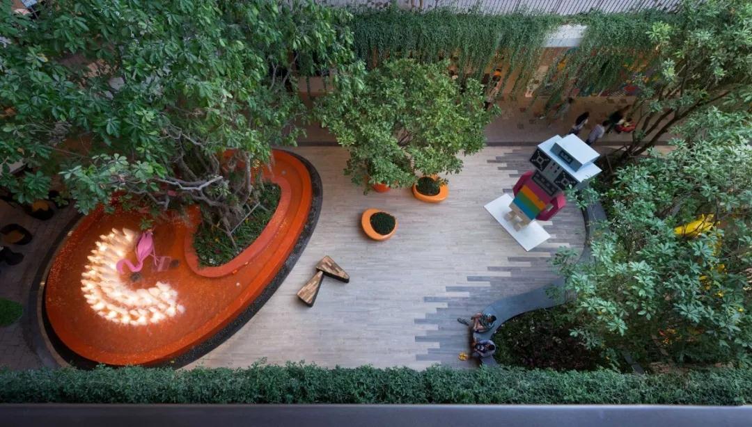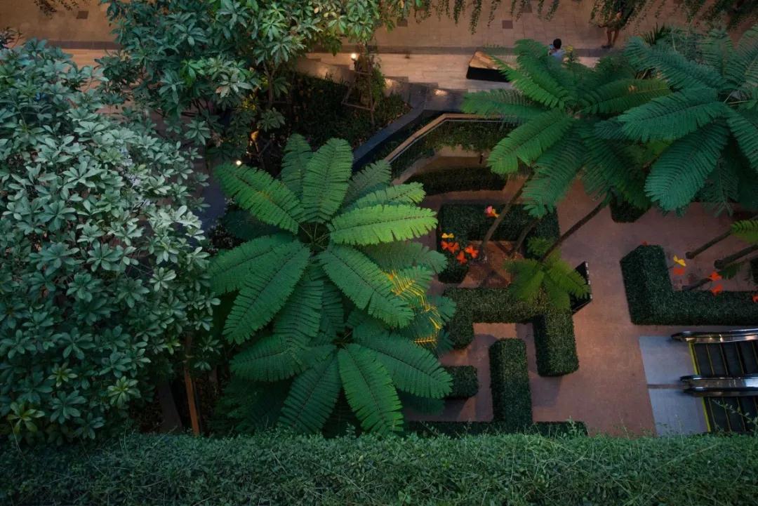 Mega Food Walk是一個(gè)延伸的半戶(hù)外擴展區,設計的“森林”采用亞熱帶到熱帶氣候的植物為環(huán)境調色板,包括精致的蕨類(lèi)植物和苔蘚,創(chuàng )造出一種獨特的商業(yè)景觀(guān)氛圍,將周?chē)牟蛷d與自然綠色融為一體。極具森林質(zhì)感的餐飲商業(yè)步行通道空間,通過(guò)互動(dòng)景觀(guān)裝置,能讓游客在一個(gè)舒適的小氣候環(huán)境下?lián)碛幸粋€(gè)愉快的體驗。