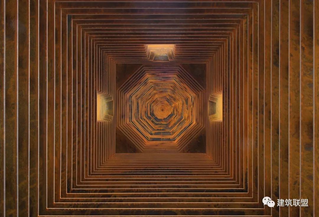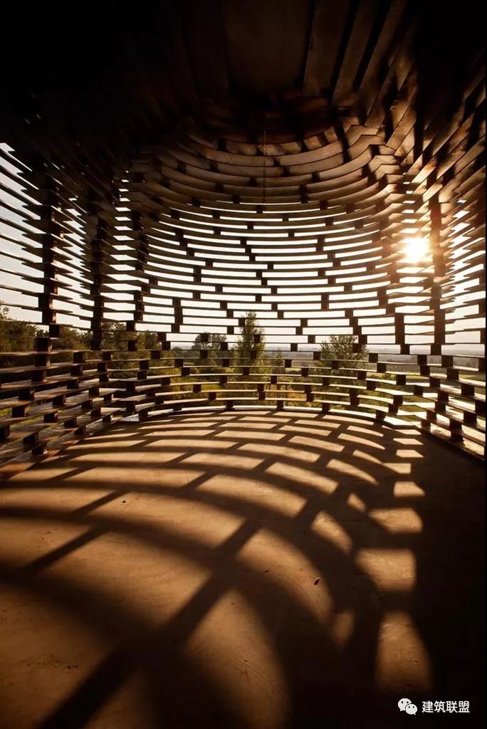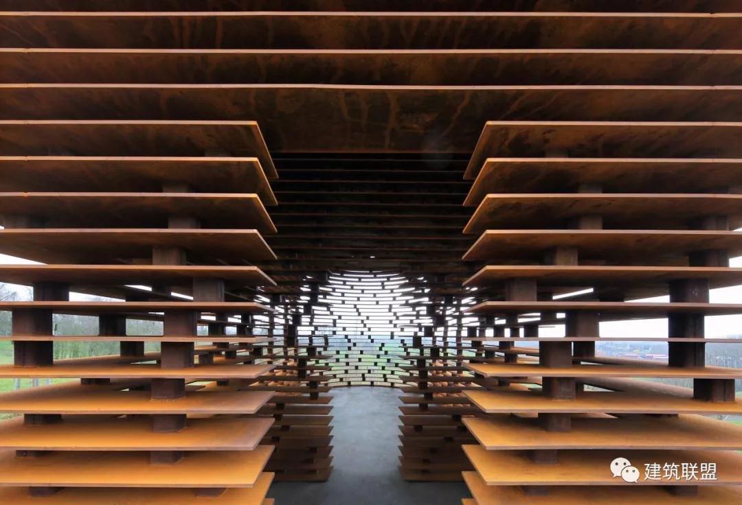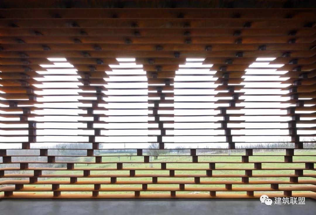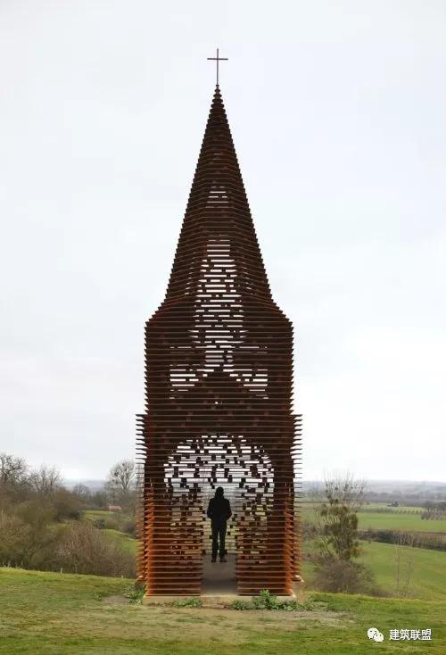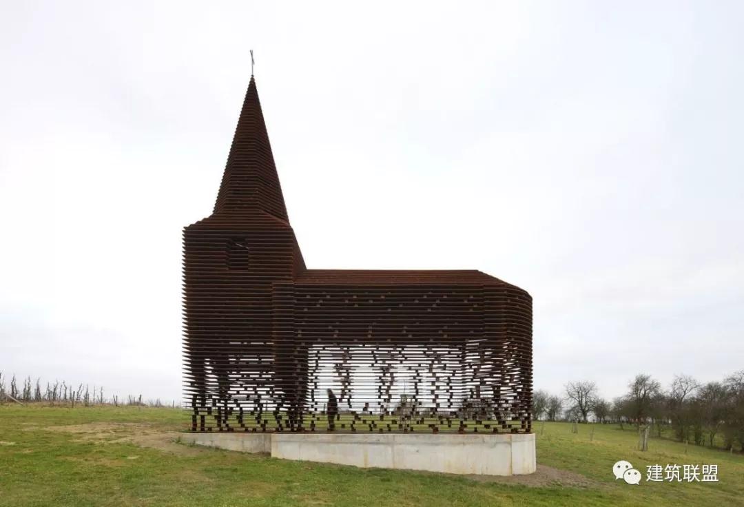 教堂總高10米,有2000片鋼片搭成100層。從外面看,這座教堂仿佛消逝解散在景觀(guān)中;從里面看,外面的景觀(guān)被抽象的線(xiàn)條重新定義了。設計的原型還是基于當地的教堂,但是通過(guò)使用水平版,傳統教堂已經(jīng)轉化為一個(gè)透明的藝術(shù)對象。