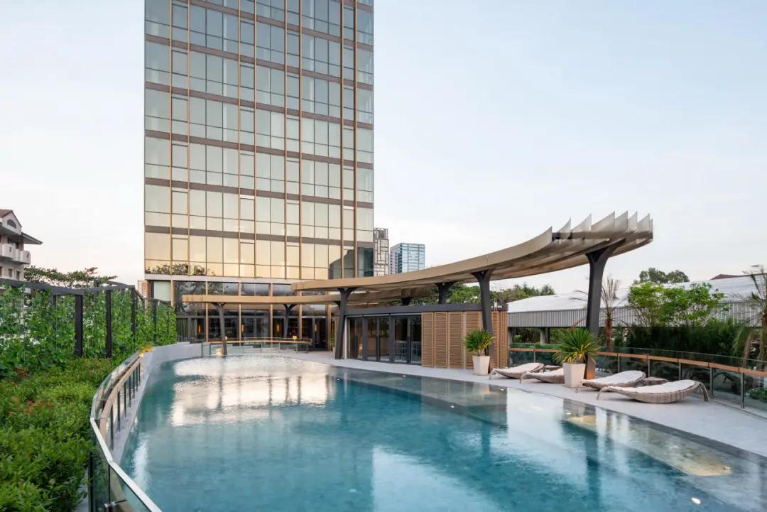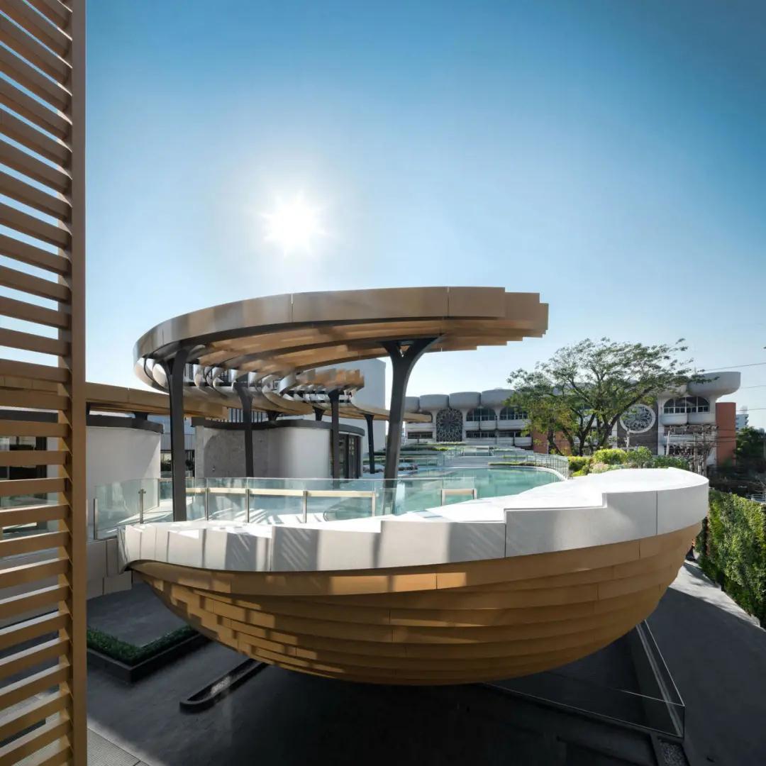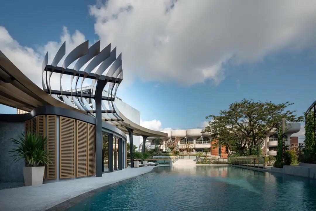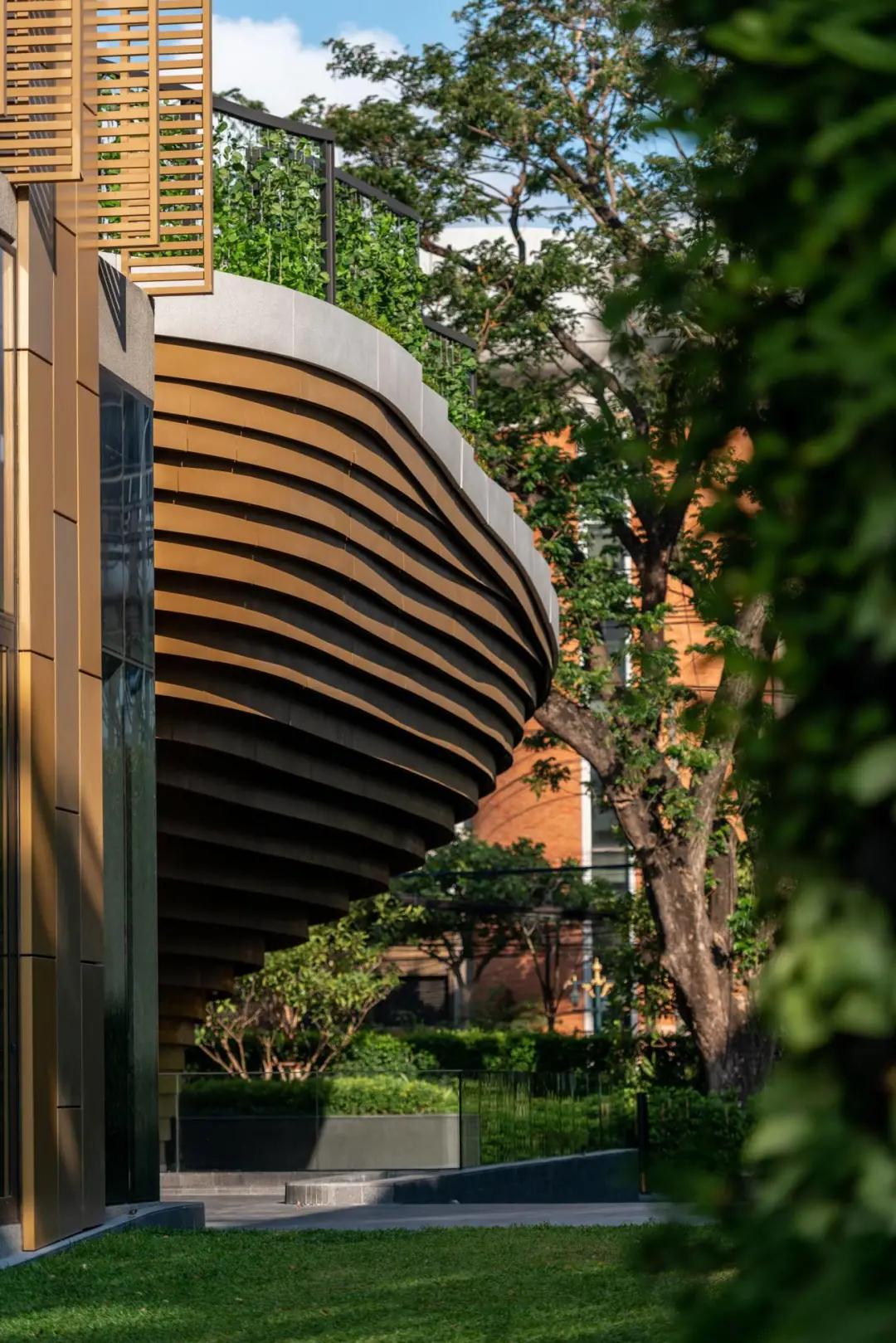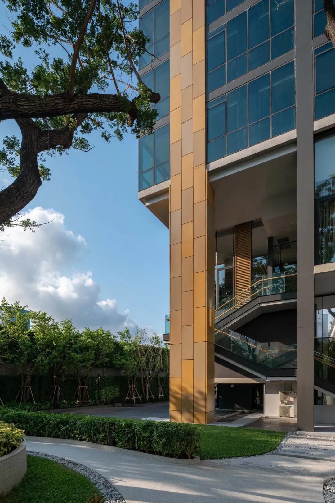 本項目的主要挑戰是法規和環(huán)評程序。意識到這個(gè)問(wèn)題后,曼谷的多住宅項目都有一個(gè)相同的模式,就是在停車(chē)場(chǎng)的裙樓上建一座塔樓。這種刻板印象并沒(méi)有那么好地傳達給鄰居。我們的策略是將項目分成兩部分,這樣做有幾個(gè)好處,一是可以騰出底層更多的綠化面積,二是可以與鄰居有更多的聯(lián)系。面對地下一層只在前樓之下的情況,可以更靈活地設計在塔樓部分的單元布局,而不需要轉移結構。它加快了施工期,這是很好的權衡,以保護場(chǎng)地上的樹(shù)木。它迫使人們通過(guò)前門(mén)大廳走進(jìn)塔樓,從而增強社區的凝聚力。