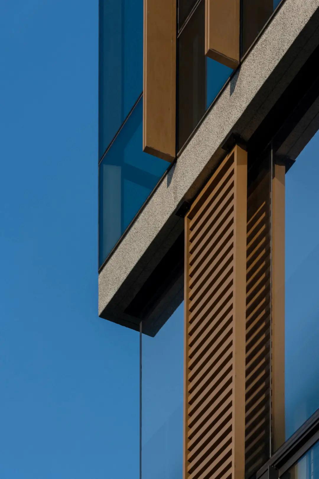 前樓設計為人的尺度感知而設計的,它的特點(diǎn)是一系列的條帶,象征著(zhù)樹(shù)木的年輪。這些條帶是為通風(fēng)而設計的;里面有幾個(gè)機械室。獨特的形狀意味著(zhù)接觸地面盡可能小的足跡,允許在陰影下使用。下面有六層的地下停車(chē)場(chǎng),人們可以進(jìn)入位于后備箱中心的停車(chē)場(chǎng),而汽車(chē)坡道位于另一側。頂部是部分設施,包括游泳池、泳池休息室和綠色屋頂的臺階。