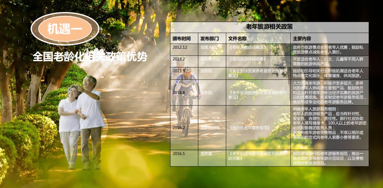 當下我國已進(jìn)入人口老齡化階段,隨著(zhù)老年人口的不斷增加,人口老齡化不斷加劇,國家出臺了一系列關(guān)于老年人出行旅游的優(yōu)惠政策,這給發(fā)展森林康養帶來(lái)了前所未有的機遇: