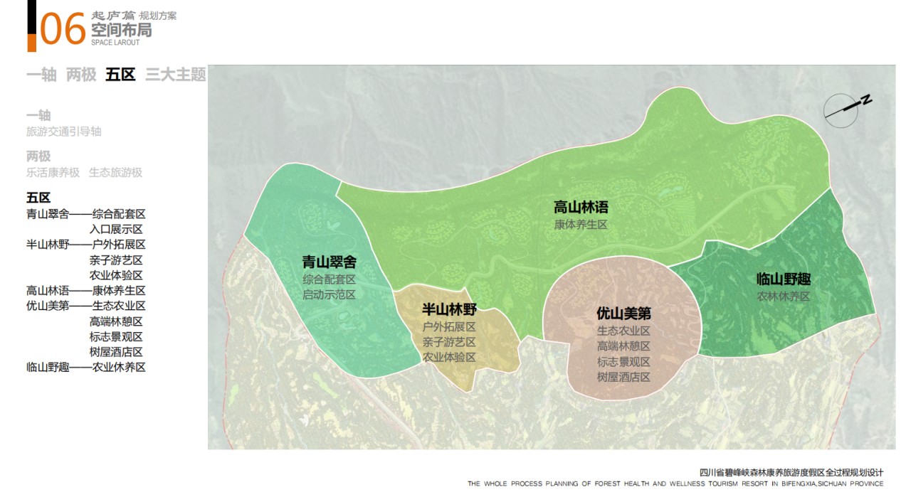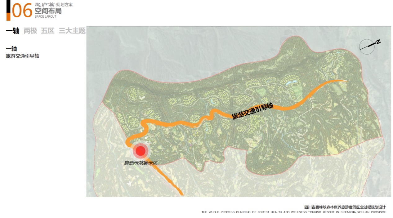 空間布局上,本項目采用了:一軸,兩級,五區,三大主題的布局方式
