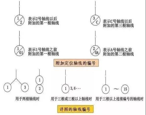 平面圖上定位軸線(xiàn)的編號,宜標注在圖樣的下方與左側,在兩軸線(xiàn)之間,有的需要用附加軸線(xiàn)表示,附加軸線(xiàn)用分數編號;