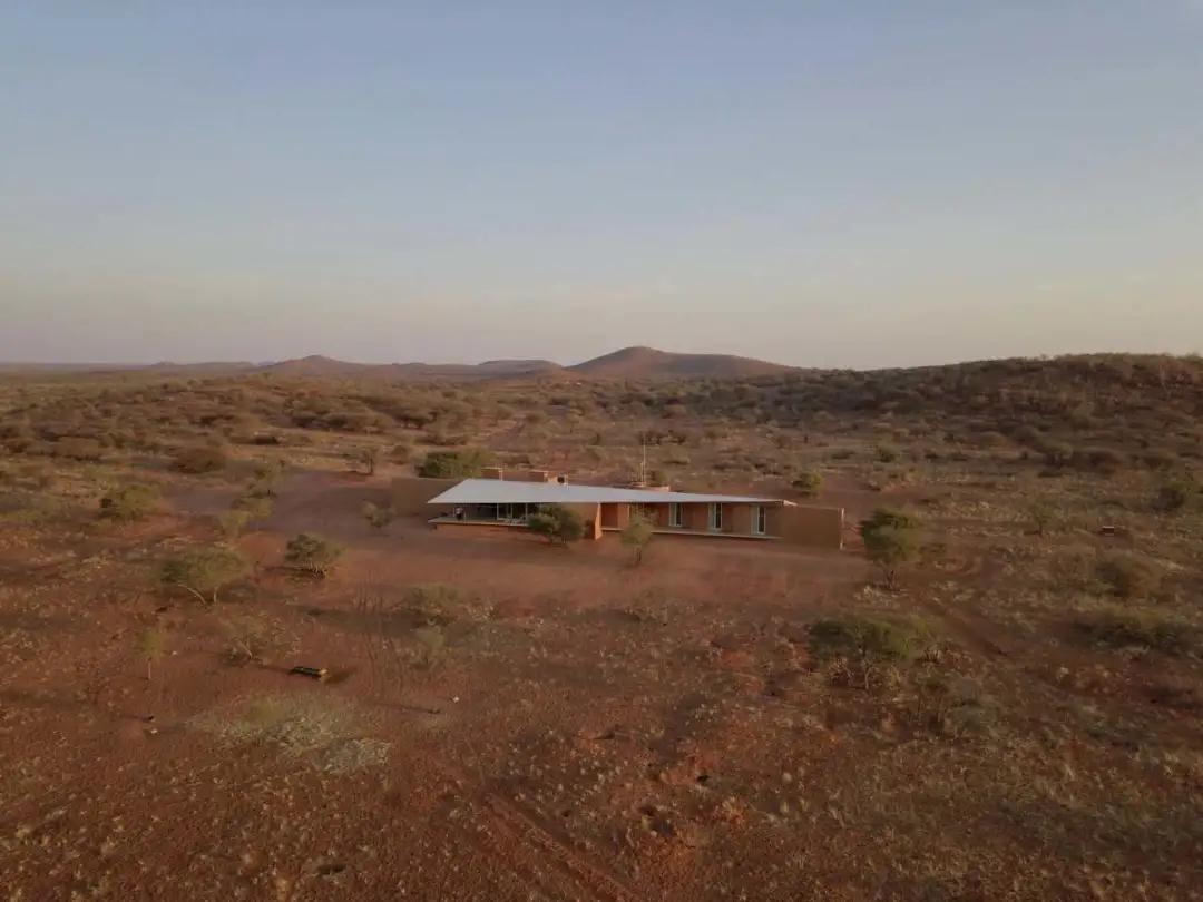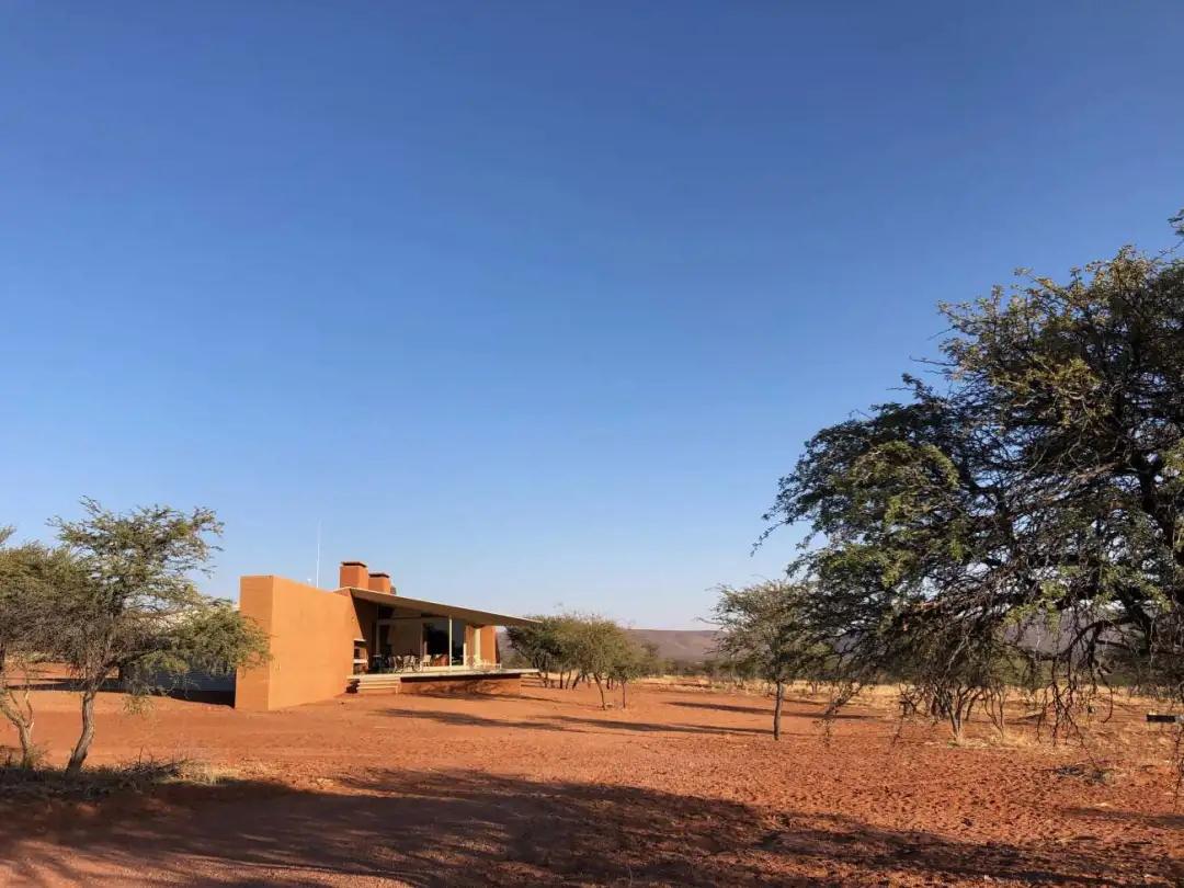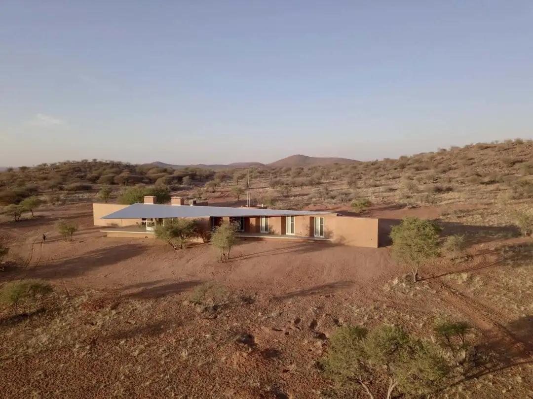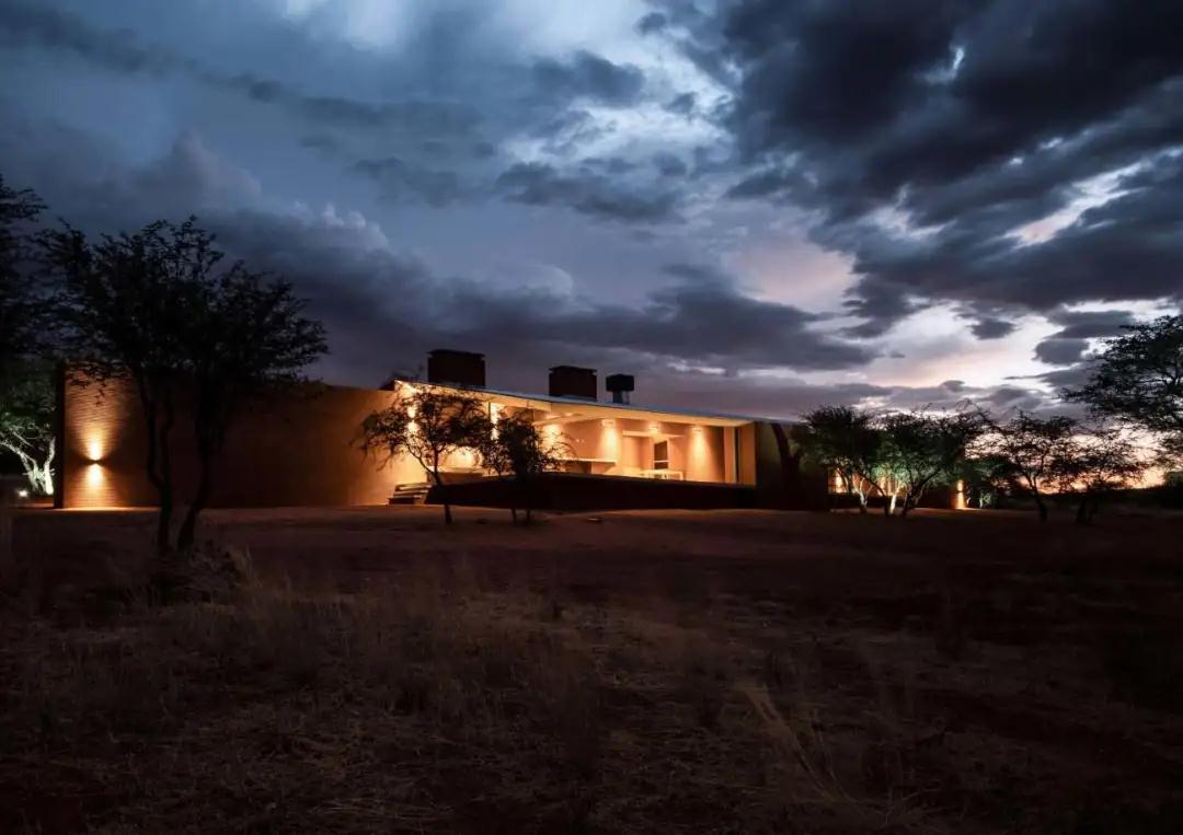 鑲嵌在紅土墻中的農場(chǎng)大門(mén),向游客介紹項目的獨特之處。從入口處開(kāi)始,一條紅塵路在散布著(zhù)荊棘樹(shù)的大草原草原上悠悠而過(guò)。走近后,小屋從壯觀(guān)的紅土中緩緩浮現,堅實(shí)的體量與深邃的陰影和簡(jiǎn)單的線(xiàn)條與周?chē)h(huán)境融為一體;低矮的斜線(xiàn)結構為游客提供了抵御納米比亞惡劣環(huán)境的庇護。