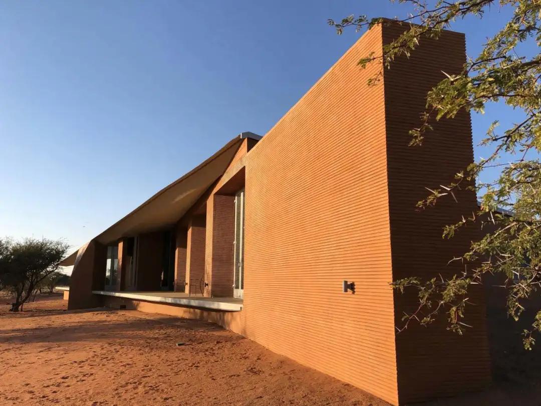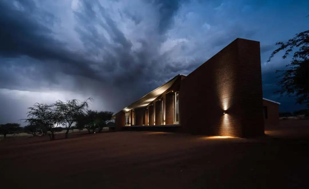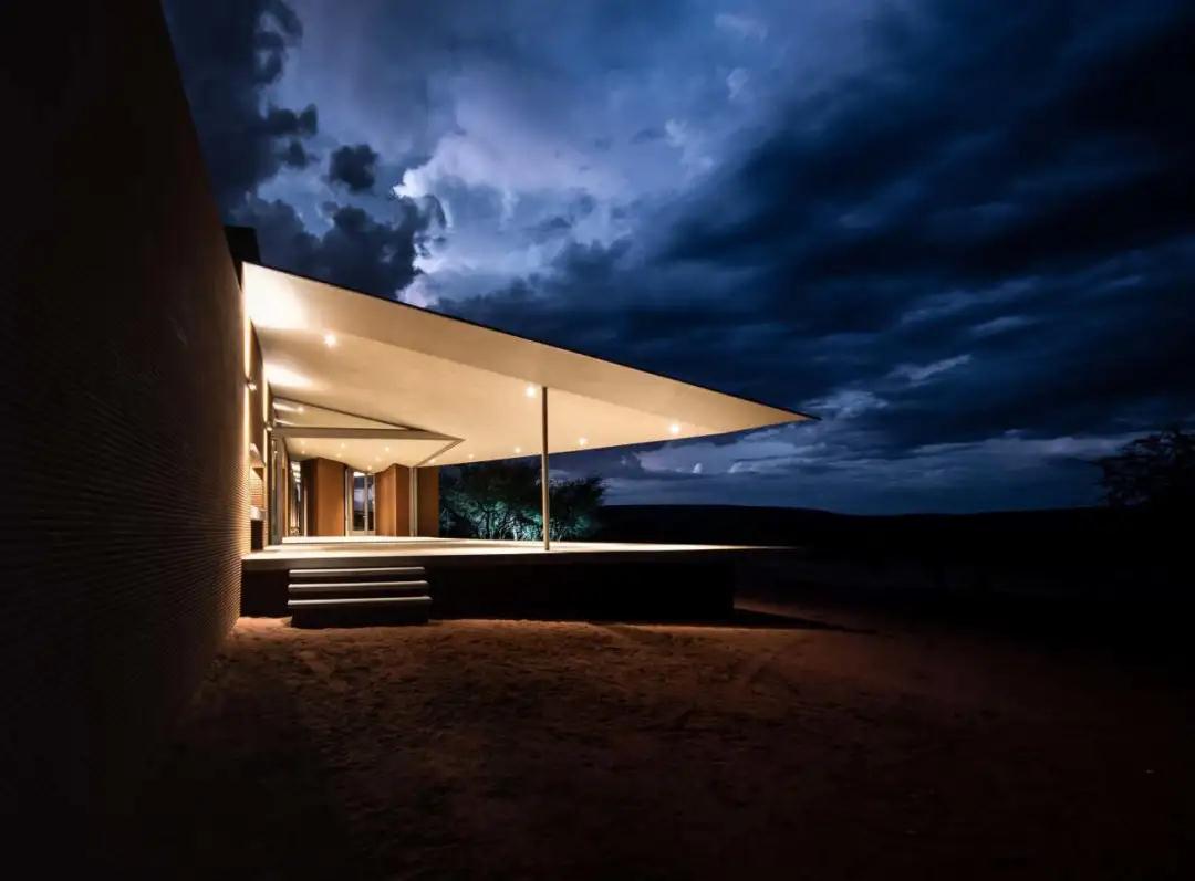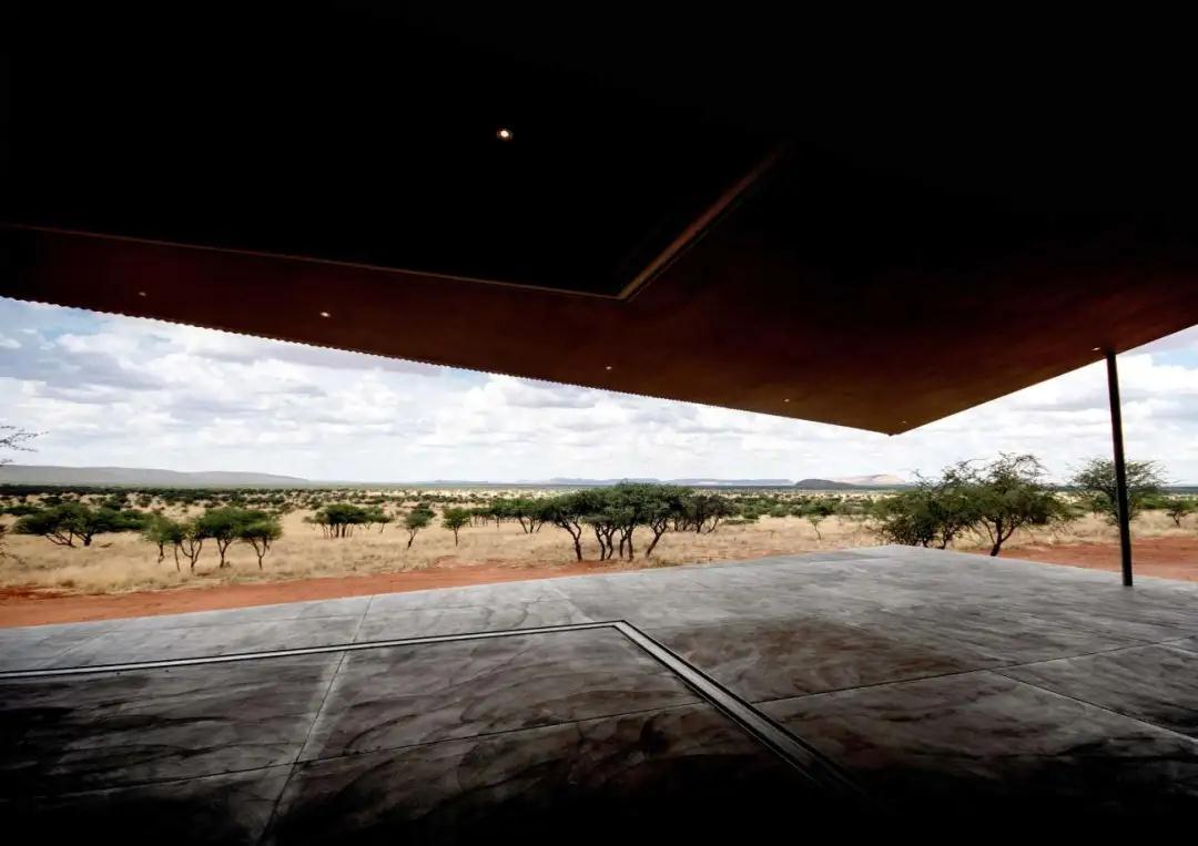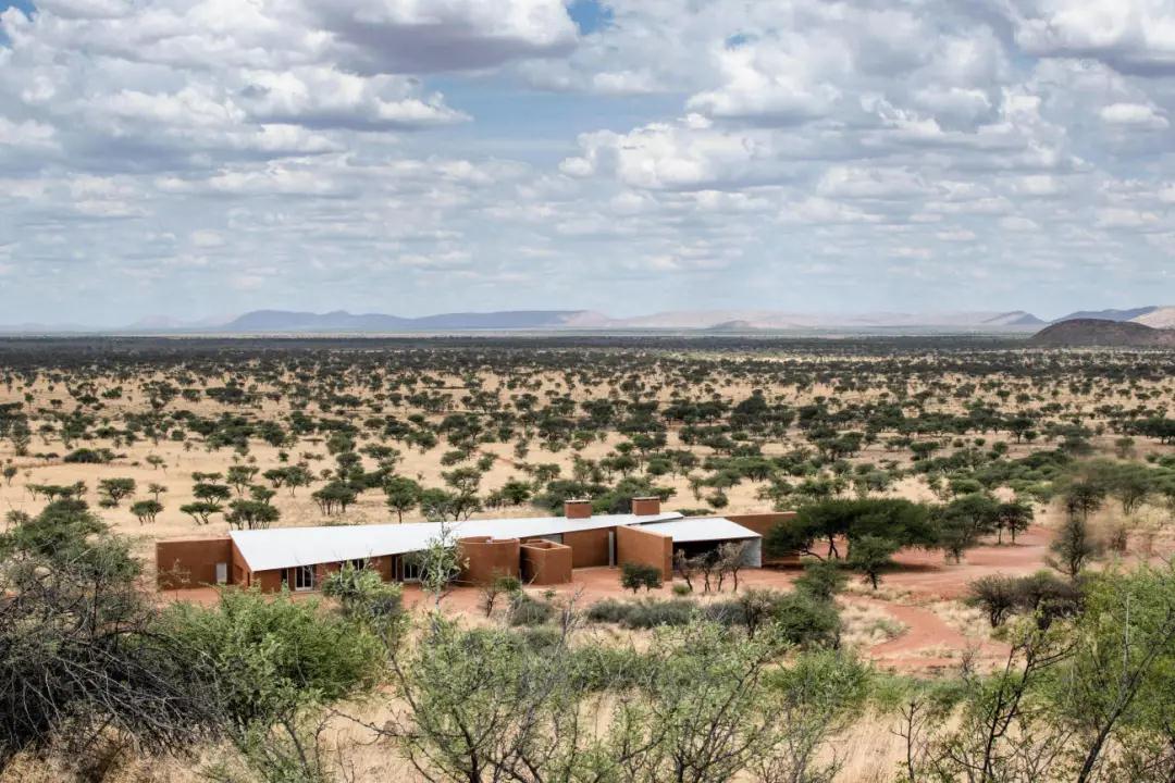 鑲嵌在紅土墻中的農場(chǎng)大門(mén),向游客介紹項目的獨特之處。從入口處開(kāi)始,一條紅塵路在散布著(zhù)荊棘樹(shù)的大草原草原上悠悠而過(guò)。走近后,小屋從壯觀(guān)的紅土中緩緩浮現,堅實(shí)的體量與深邃的陰影和簡(jiǎn)單的線(xiàn)條與周?chē)h(huán)境融為一體;低矮的斜線(xiàn)結構為游客提供了抵御納米比亞惡劣環(huán)境的庇護。