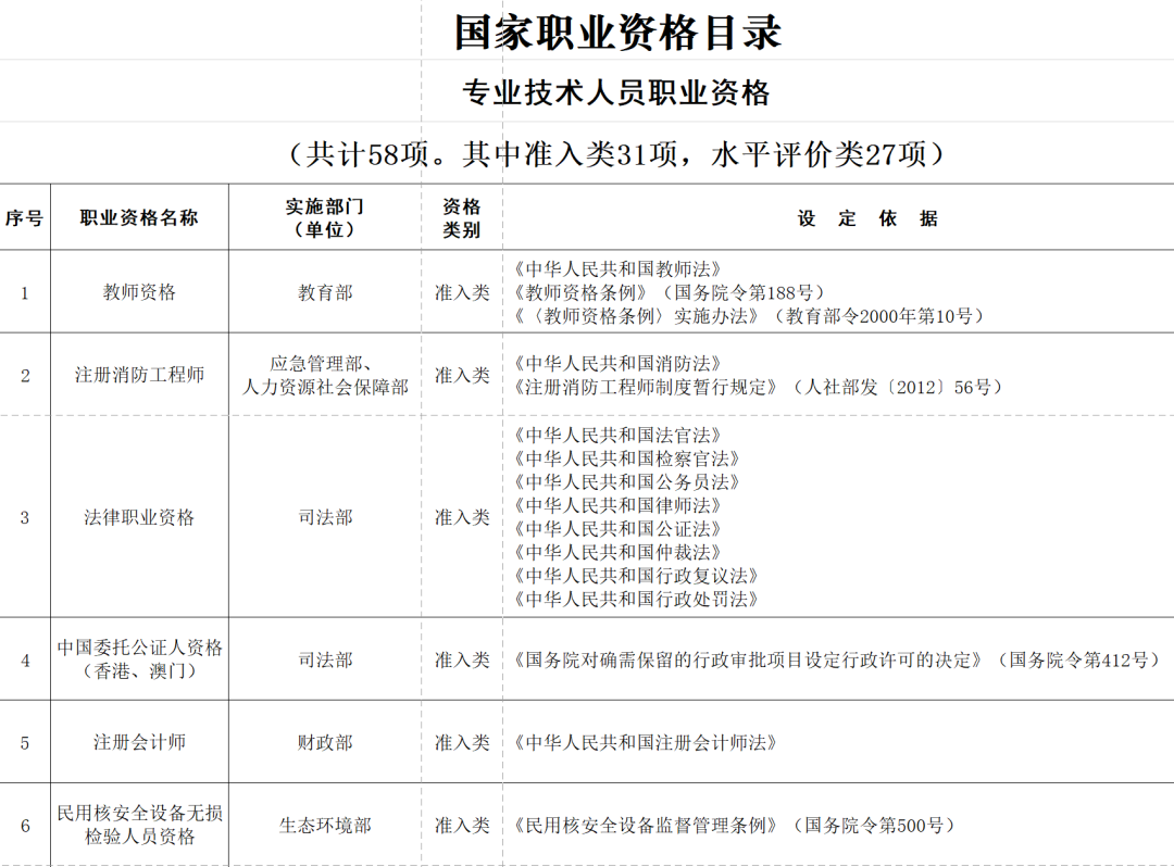 注1:會(huì )計從業(yè)資格,鄉村獸醫資格,出入境檢疫處理人員資格,注冊測繪師,勘察設計注冊石油天然氣工程師、注冊冶金工程師、注冊采礦/礦物工程師、注冊機械工程師調出《國家職業(yè)資格目錄》。