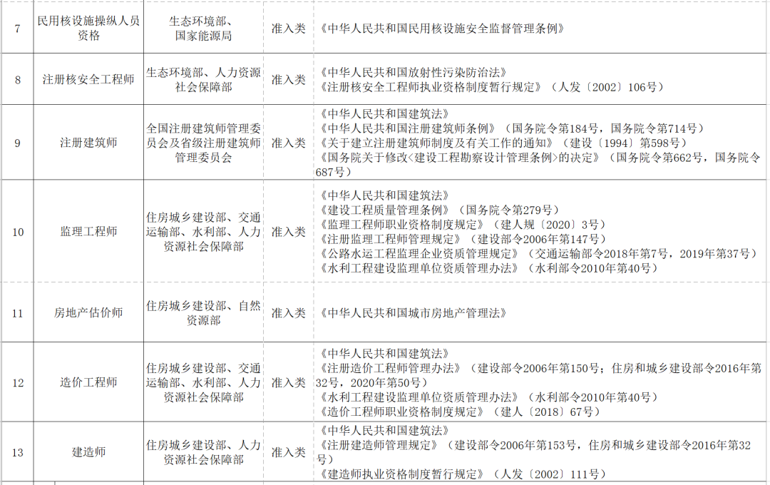 人社部今天發(fā)布了58項國家職業(yè)資格目錄發(fā)布,其中31項準入類(lèi),27項水平評價(jià)類(lèi)。咱們的建造師、勘察設計類(lèi)、建筑師、消防師、監理師等都輸入準入類(lèi)。此次的重大調整就是:測繪師調出了職業(yè)資格目錄,注冊規劃師改名“國土空間規劃師”,以后簡(jiǎn)稱(chēng)“國師”,同時(shí)由準入類(lèi)變成了水平評價(jià)類(lèi),注冊設備監理師同樣如此……