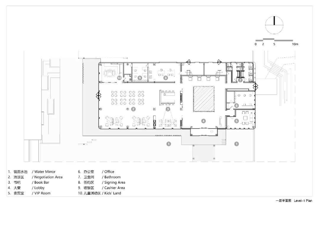 整體建筑形態(tài)就像一個(gè)盒子,與景觀(guān)水面生動(dòng)融合,打造出一個(gè)外實(shí)內虛的景框。外部石材幕墻形成一個(gè)框,內部玻璃虛且透,形成一個(gè)長(cháng)條的展示面,建筑內部吧臺、洽談區一覽無(wú)余,展示了一種開(kāi)放的建筑態(tài)度。