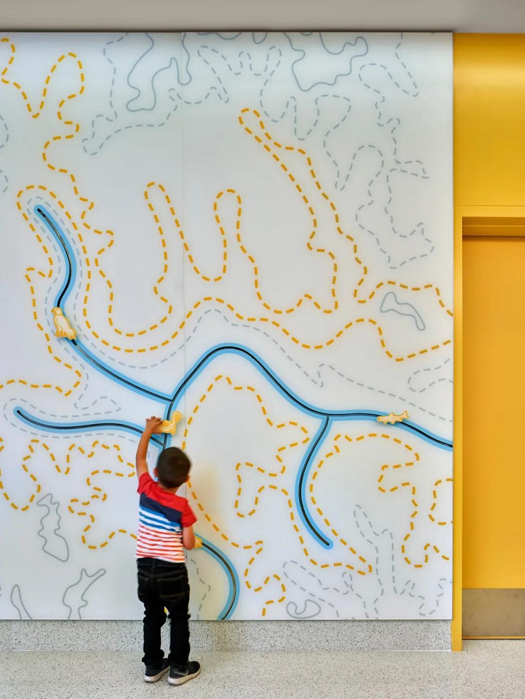 一面描繪著(zhù)雪蘭多山谷地形圖的互動(dòng)墻,邀請孩子們與其中的動(dòng)物模型一起玩耍,這些動(dòng)物模型