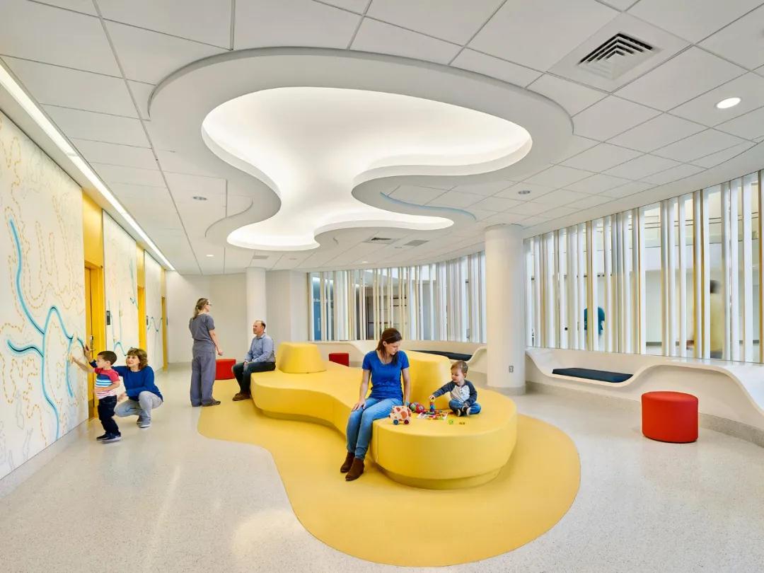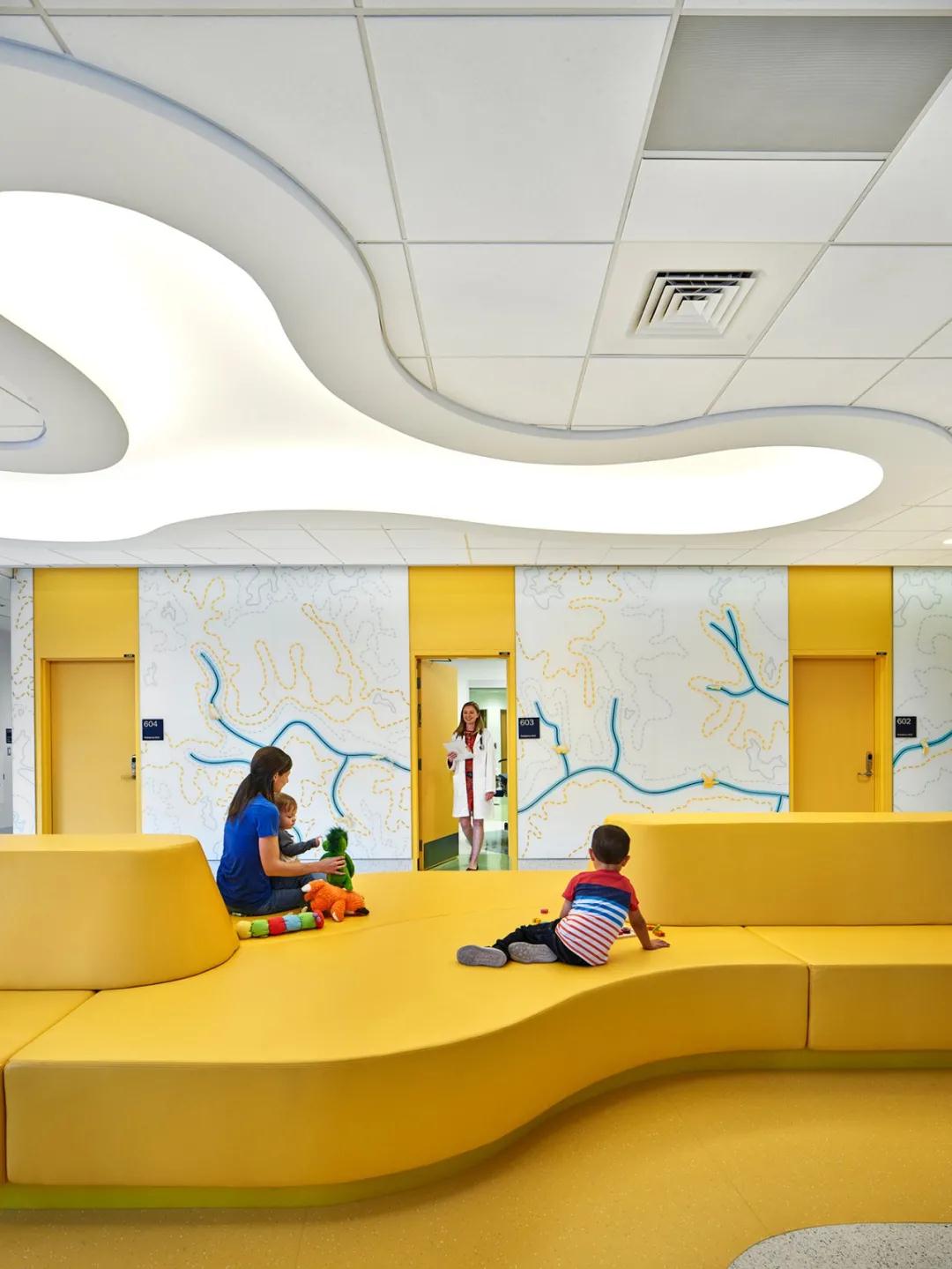 在急診室的新空間中,有12間安全的行為健康室,為處于急性心理健康困境的患者提供了一個(gè)安全、平靜的環(huán)境,還有一間專(zhuān)門(mén)的兒科檢查和等候室,歡迎幼小的患者,這里有明亮的黃色沙發(fā)、兒童大小的座椅、造型有趣的天花板燈,以及通往光線(xiàn)充足的中庭的景觀(guān)。