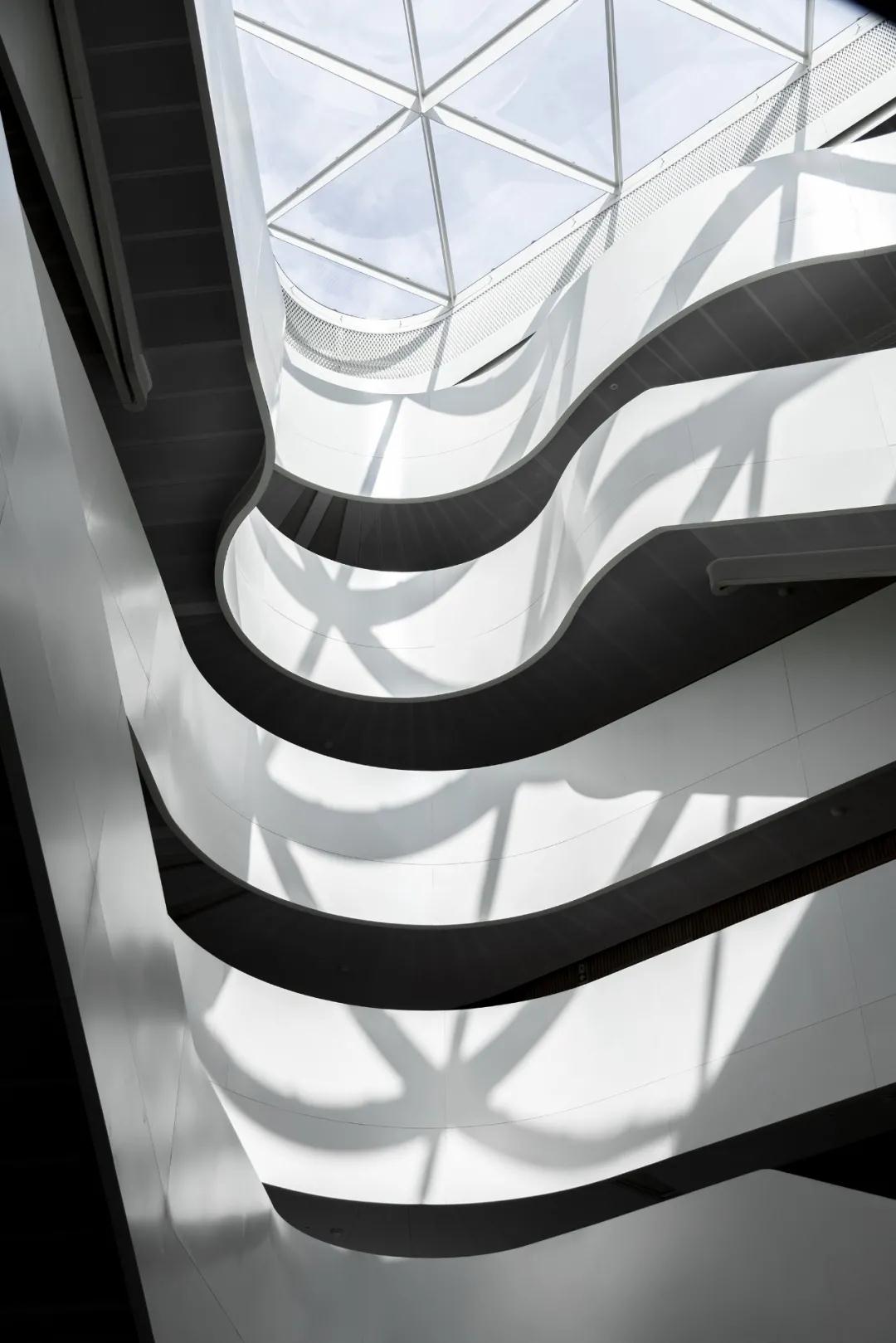 一個(gè)壯觀(guān)的頂部照明中庭以其螺旋形的垂直連接將整個(gè)建筑連接起來(lái)。大樓還設有一個(gè)250個(gè)座位的禮堂,一個(gè)向公眾開(kāi)放的茶室,一個(gè)公共廚房/餐廳和一個(gè)閱覽室。