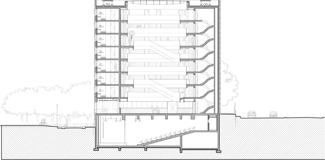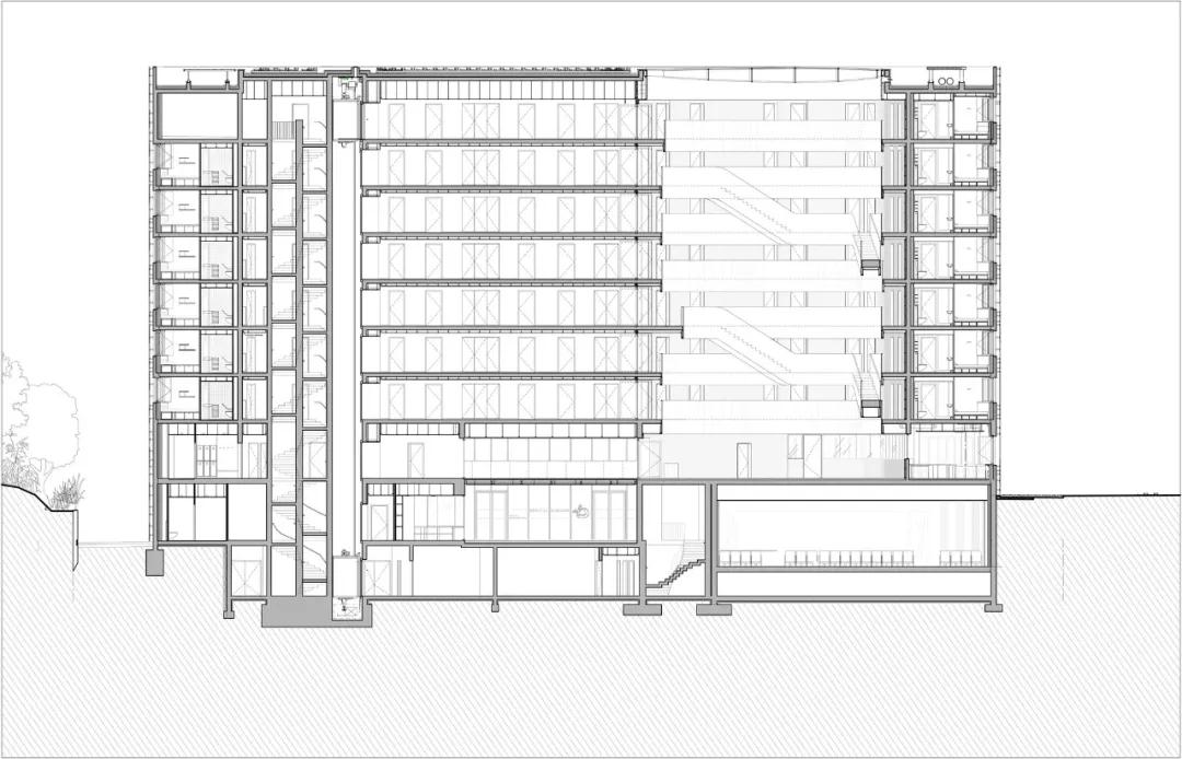 除了將日光引入建筑中心,中庭還鼓勵居民之間進(jìn)行更多的互動(dòng);它允許學(xué)生在一個(gè)非正式的環(huán)境中見(jiàn)面和交流;它避免了通常困擾宿舍的冗長(cháng)、黑暗、單調的走廊;由于其開(kāi)放的樓梯,它使樓層之間的連接成為一個(gè)社會(huì )奇觀(guān);它為居民提供了展覽空間。