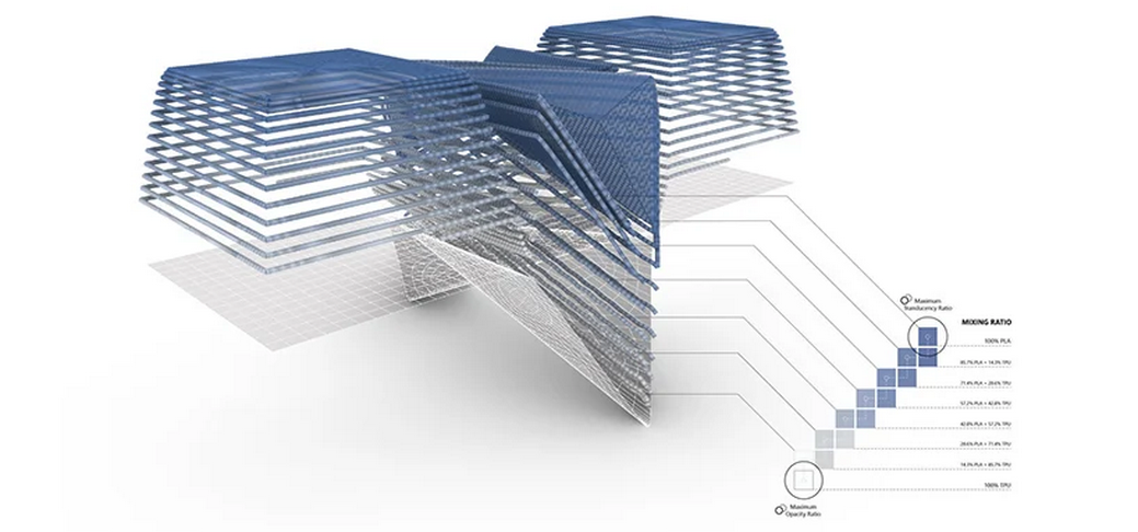 設計團隊從廣泛的材料研究開(kāi)始,確定了兩種可回收的熱塑性塑料-剛性PLA和柔性TPU,制成可折疊多材料面板。該面板為3D打印平面,并通過(guò)集成的制圖系統進(jìn)行了三維制作。