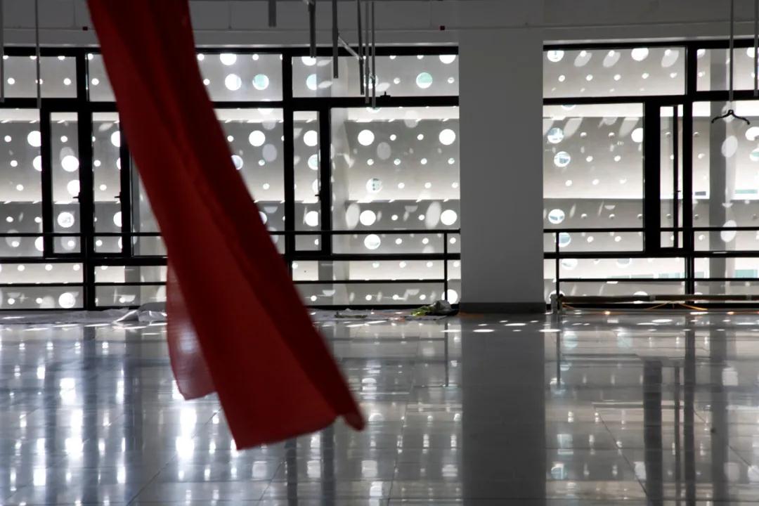 鉆孔之后,彎折的板片更顯輕盈,更易懸掛。在施工期間,滑輪從孔洞穿過(guò),將板片抬升,最終定位安裝。孔洞也在室內投下陰影,幻化萬(wàn)千。