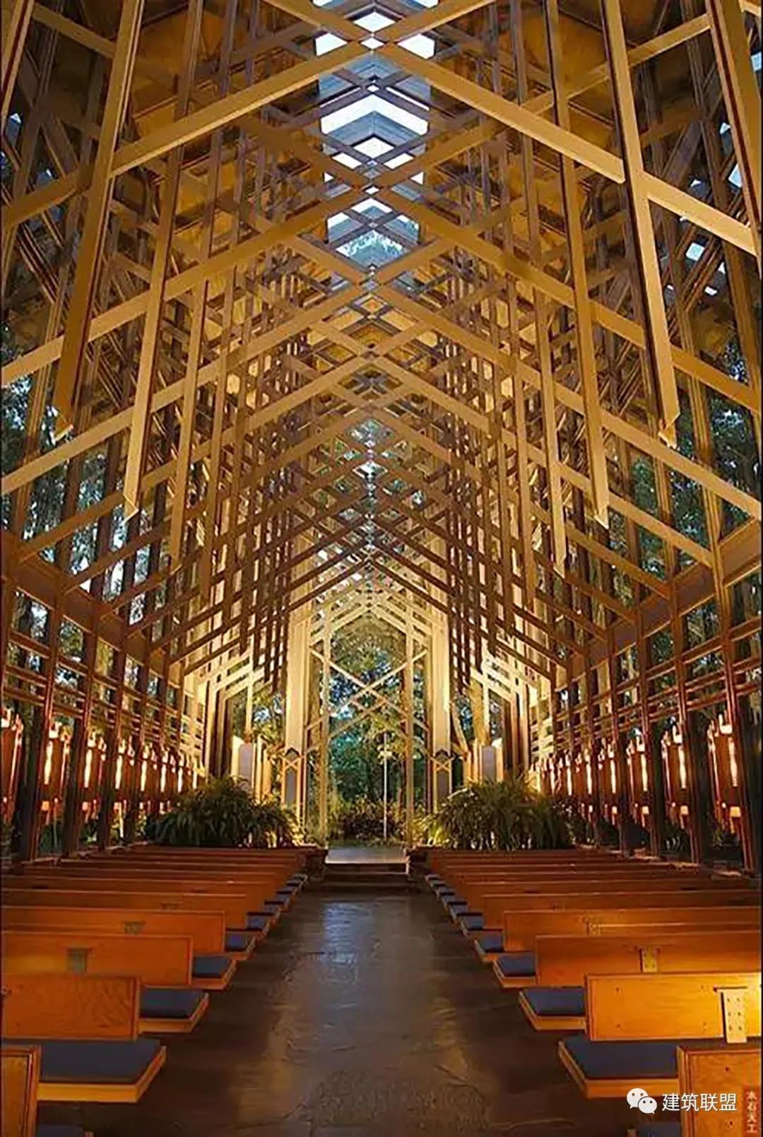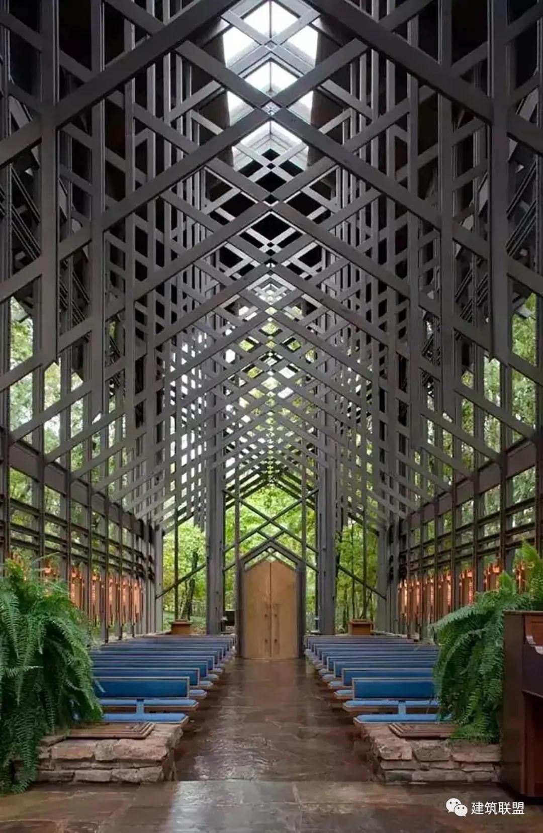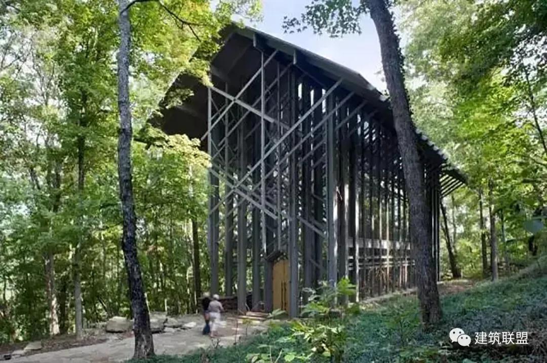 Thorncrown Chapel教堂隱身在美國阿肯色州的奧索卡山脈的深林中,周?chē)际窍饦?shù)、松鼠和楓樹(shù)。這座教堂已經(jīng)載入美國歷史,被AIA列為20世紀十大建筑之一。在美國建筑學(xué)會(huì )評選的20世紀最佳設計中名列第四。