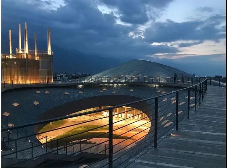 建筑輕柔漂浮的屋頂宛若蒼山映于洱海的倒影,呼應著(zhù)周?chē)B綿的地形,吸引著(zhù)游客的來(lái)訪(fǎng)。露天廣場(chǎng)與劇場(chǎng)“盒子”之間探索了一種建筑與景觀(guān)地形一體化的空間對話(huà),在二者交接處形成了廣場(chǎng)到半室外表演空間的自然轉化。