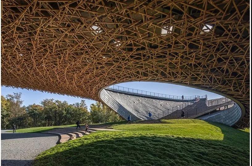 表演空間模糊了自身與自然的邊界,使得表演者與觀(guān)眾間也沒(méi)有了距離。屋頂如周?chē)荷揭话憧梢缘巧?,之上開(kāi)闊的風(fēng)景正是這里“田野放歌”的人們經(jīng)常體會(huì )到的自然遼闊。