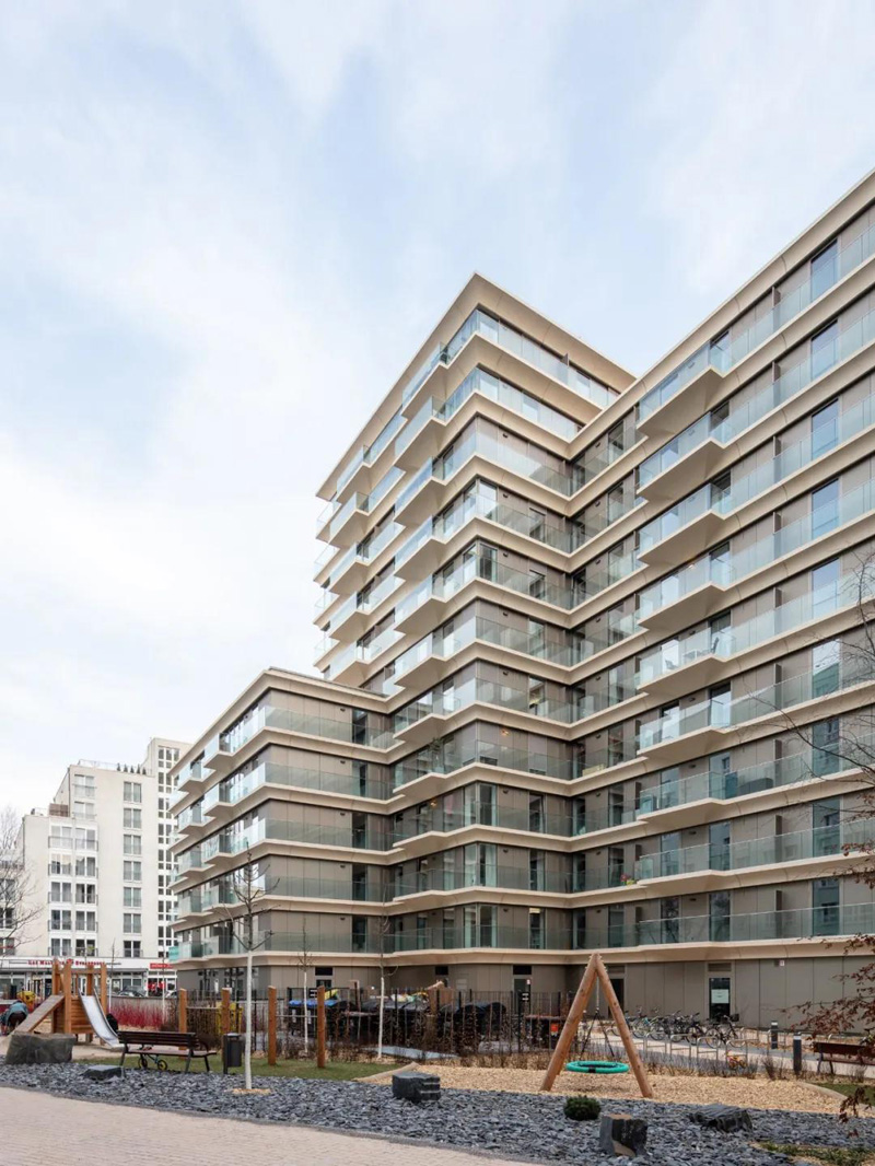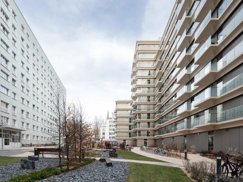 新的住宅樓Koenigstadt-Quartier位于柏林弗里德里希沙因的Volkspark Friedrichshain和Alexanderplatz之間。該項目是以柏林歷史上的科尼格斯塔特區命名的,該區延伸到米特、普倫茨勞伯和弗里德里希沙因的部分地區。
