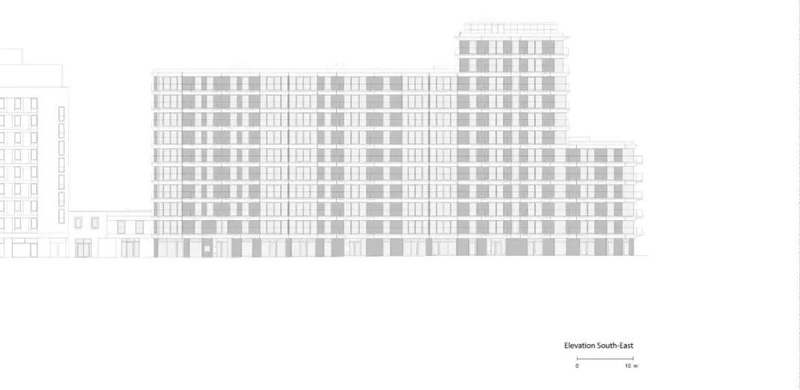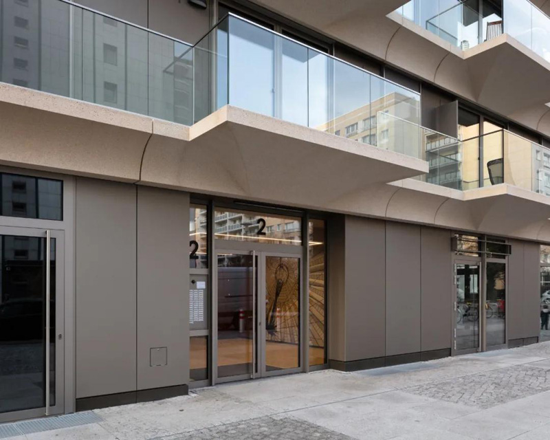 一座六層高的錯落有致的正面建筑使屋檐高度恢復到柏林的歷史尺寸,并從側面通往巴尼姆大街上的一個(gè)公共內院。