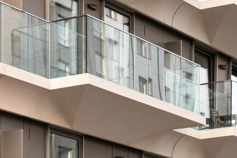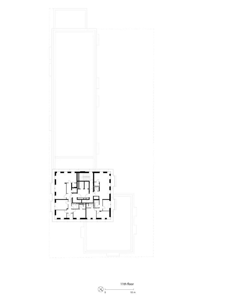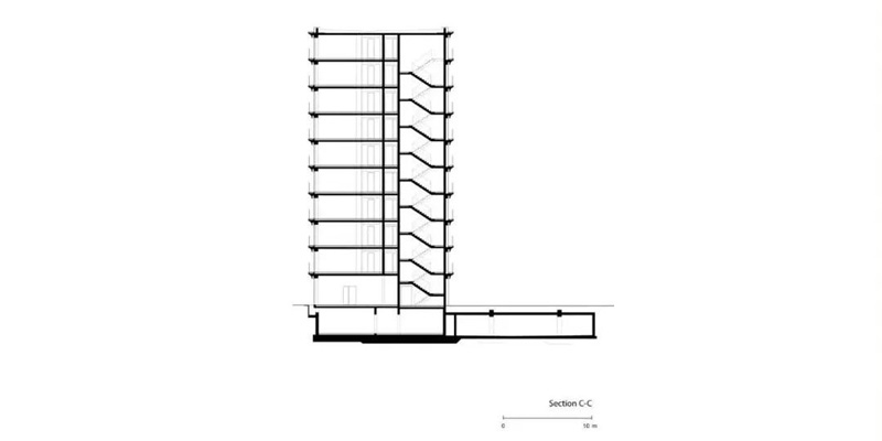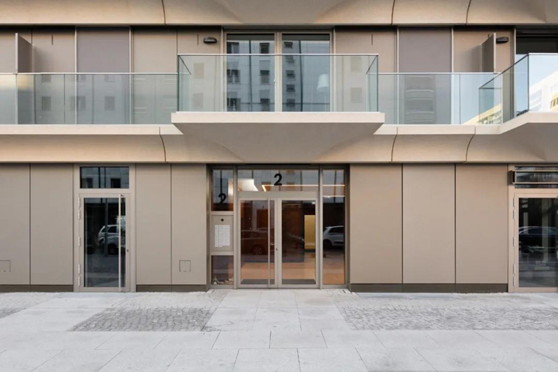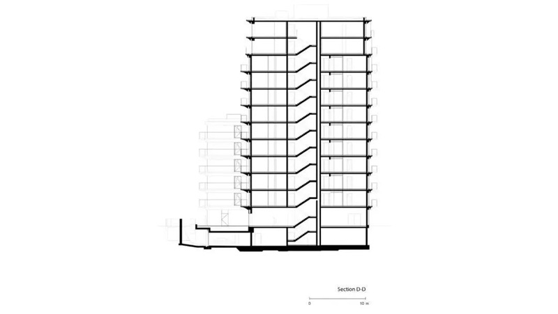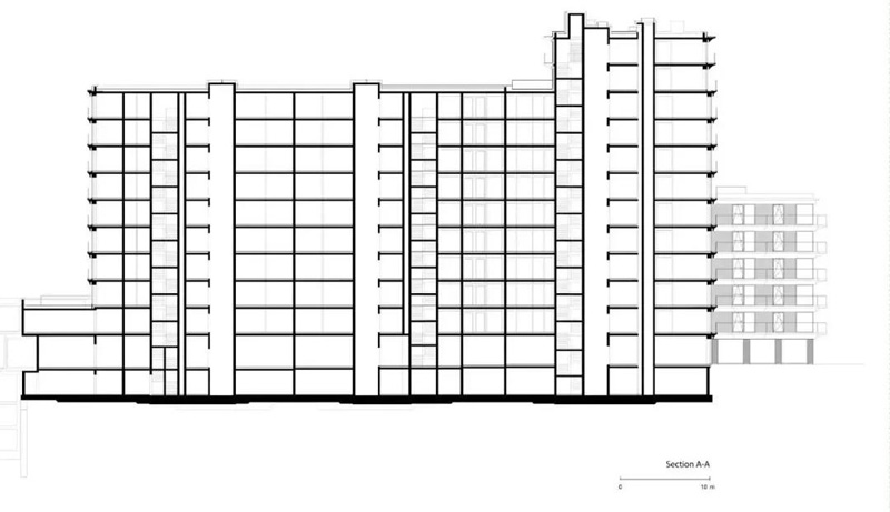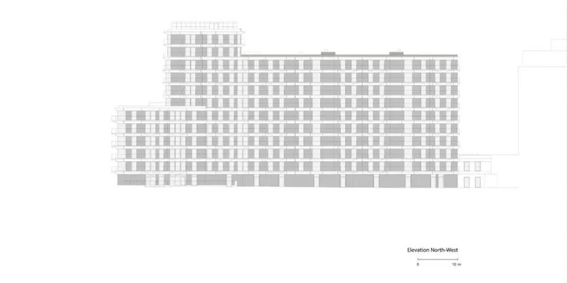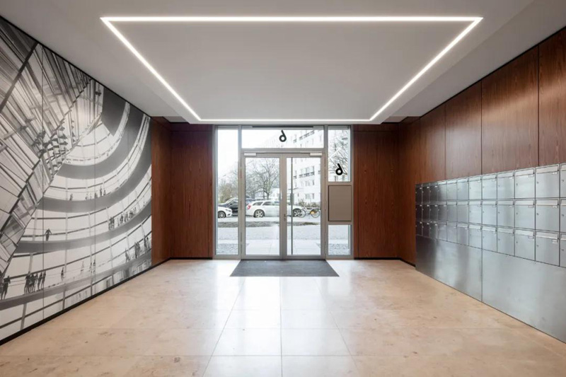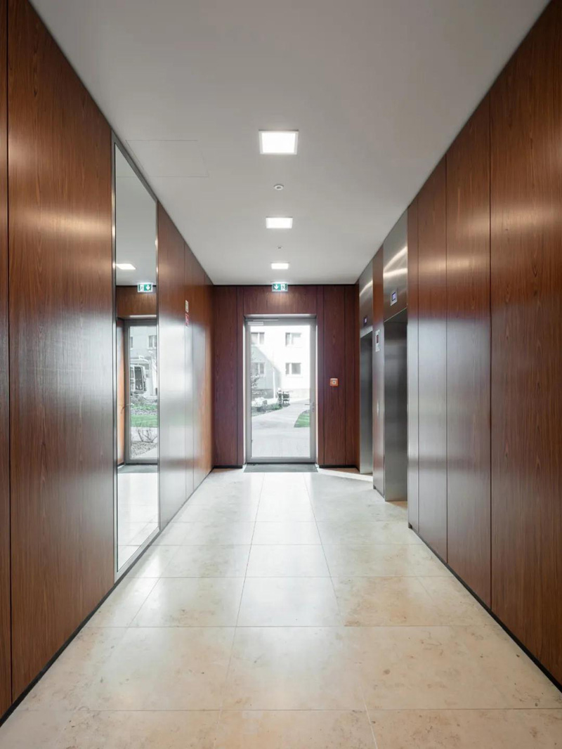 在另一端,底層和高層將該建筑群與相鄰的建筑物連接起來(lái)。除了底層的商業(yè)單位外,這里只建造了公寓。盡管它的尺寸很大,但通過(guò)其房間的高度、寬大的窗戶(hù)正面和開(kāi)放的設計、平坦的玻璃底層,該建筑呈現出明亮和開(kāi)放。