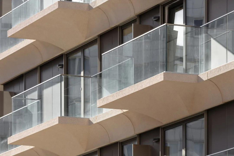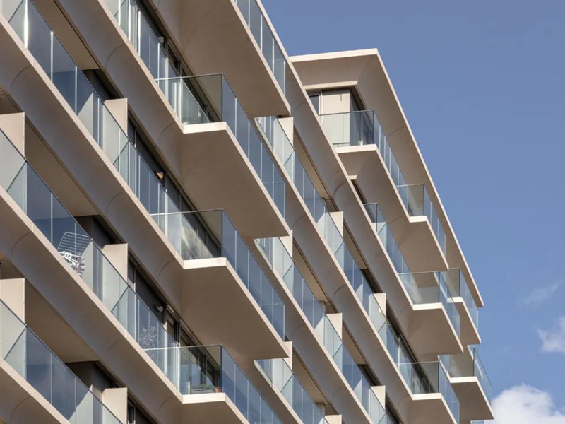 奢華的設計,由彩色建筑混凝土制成的凹槽式檐條,與陽(yáng)臺、木屋和落地窗形成一條流動(dòng)的線(xiàn),使外墻有了額外的可塑性和張力。狹窄的連續護欄支撐著(zhù)水平重點(diǎn),它與透明和不透明的玻璃元素的節奏一起,賦予了該體量一個(gè)明確的特征。