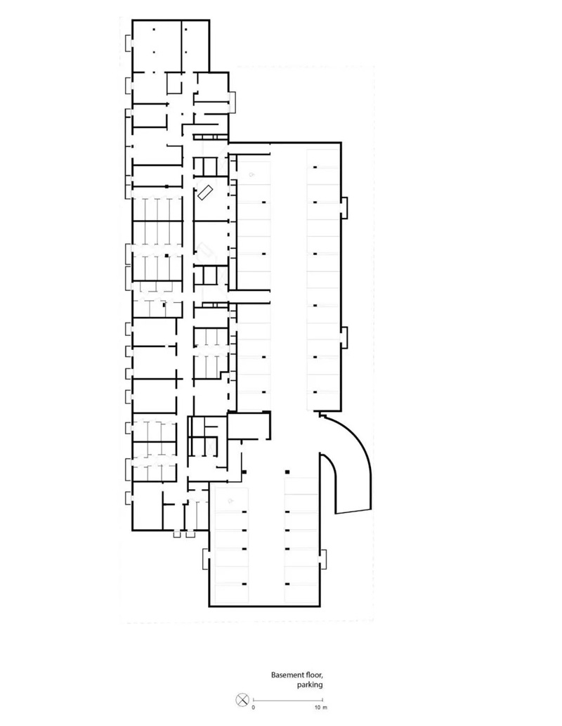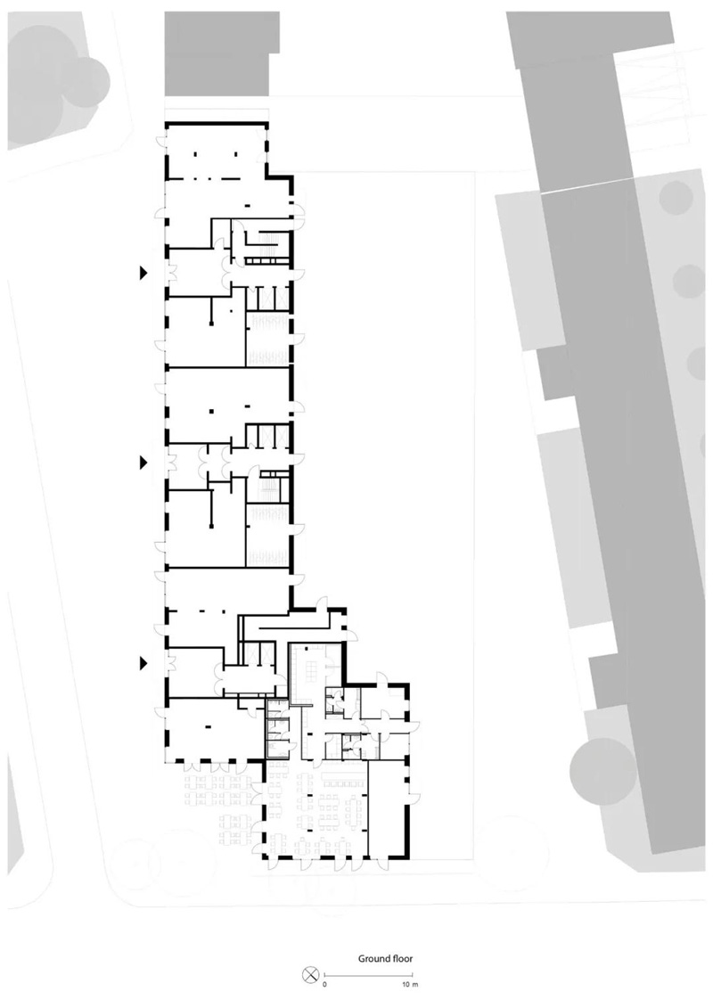 入口和出口位于門(mén)房旁邊。建筑還規劃了240個(gè)自行車(chē)停車(chē)位,它們位于地下室和一層的自行車(chē)房和庭院的露天設施中。