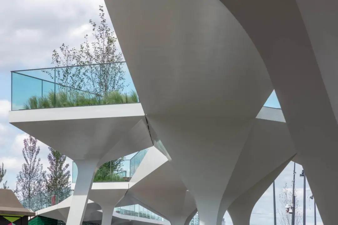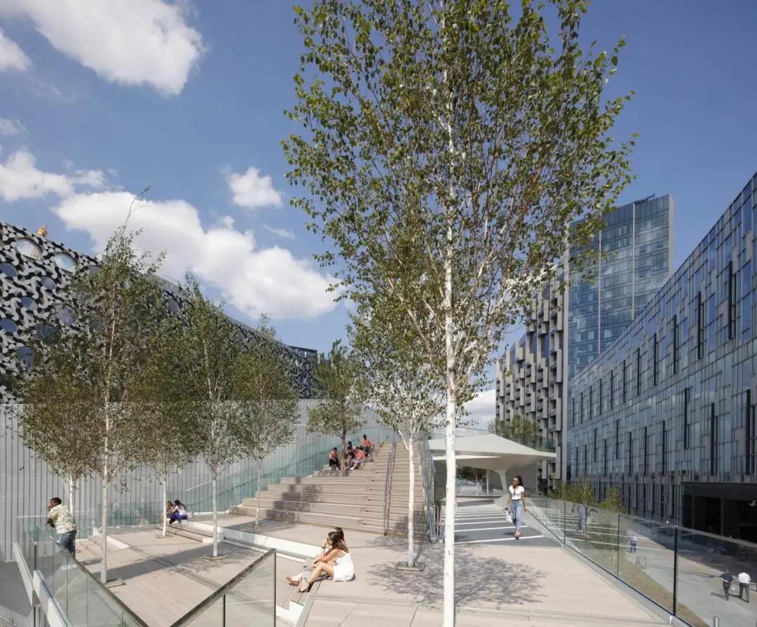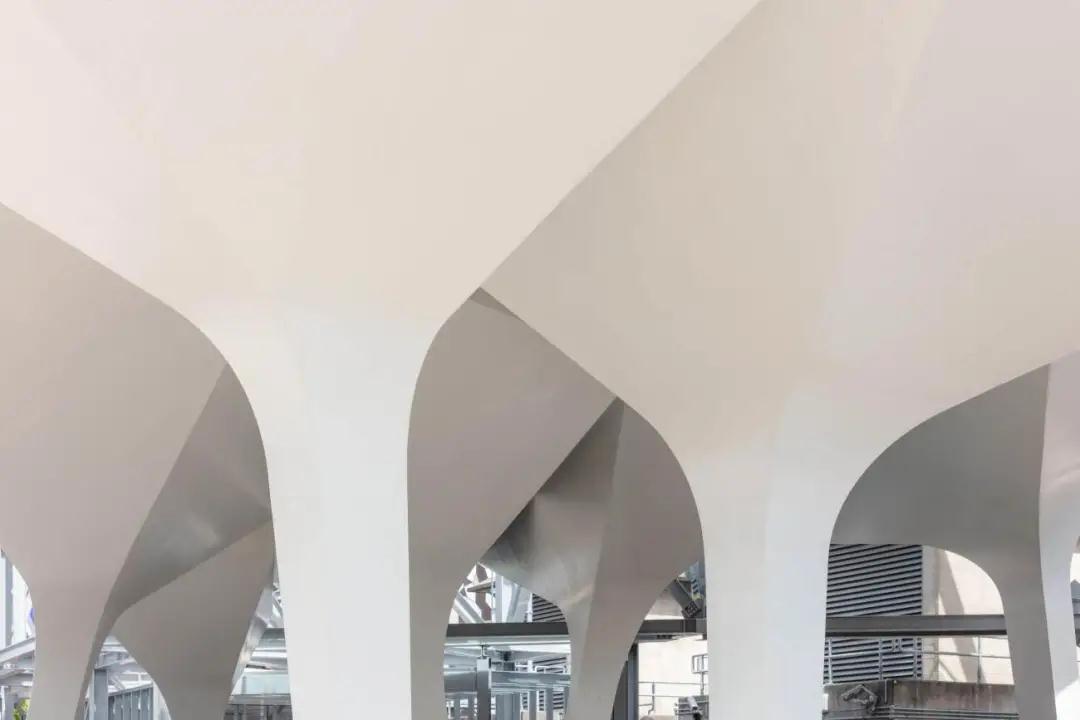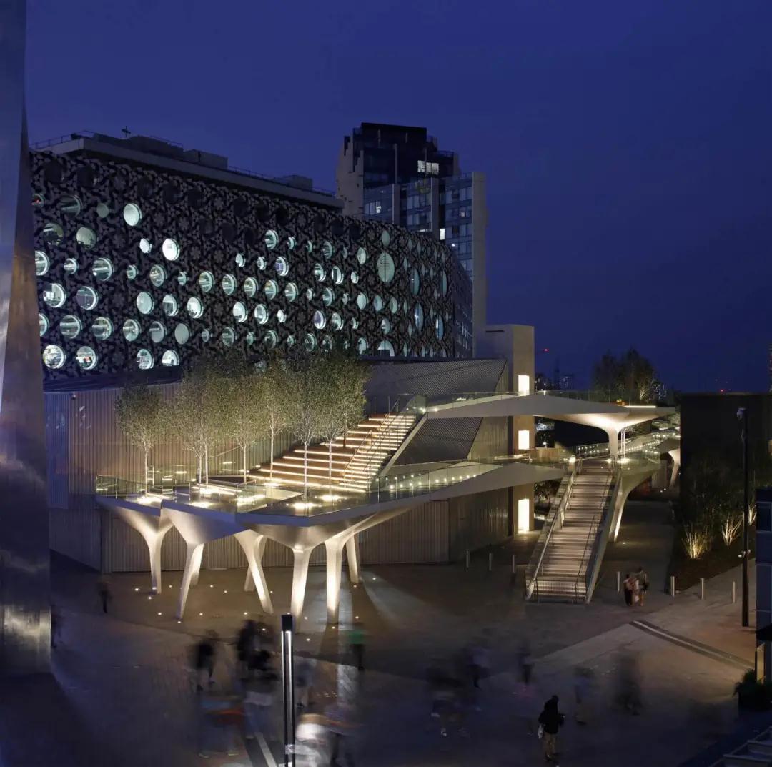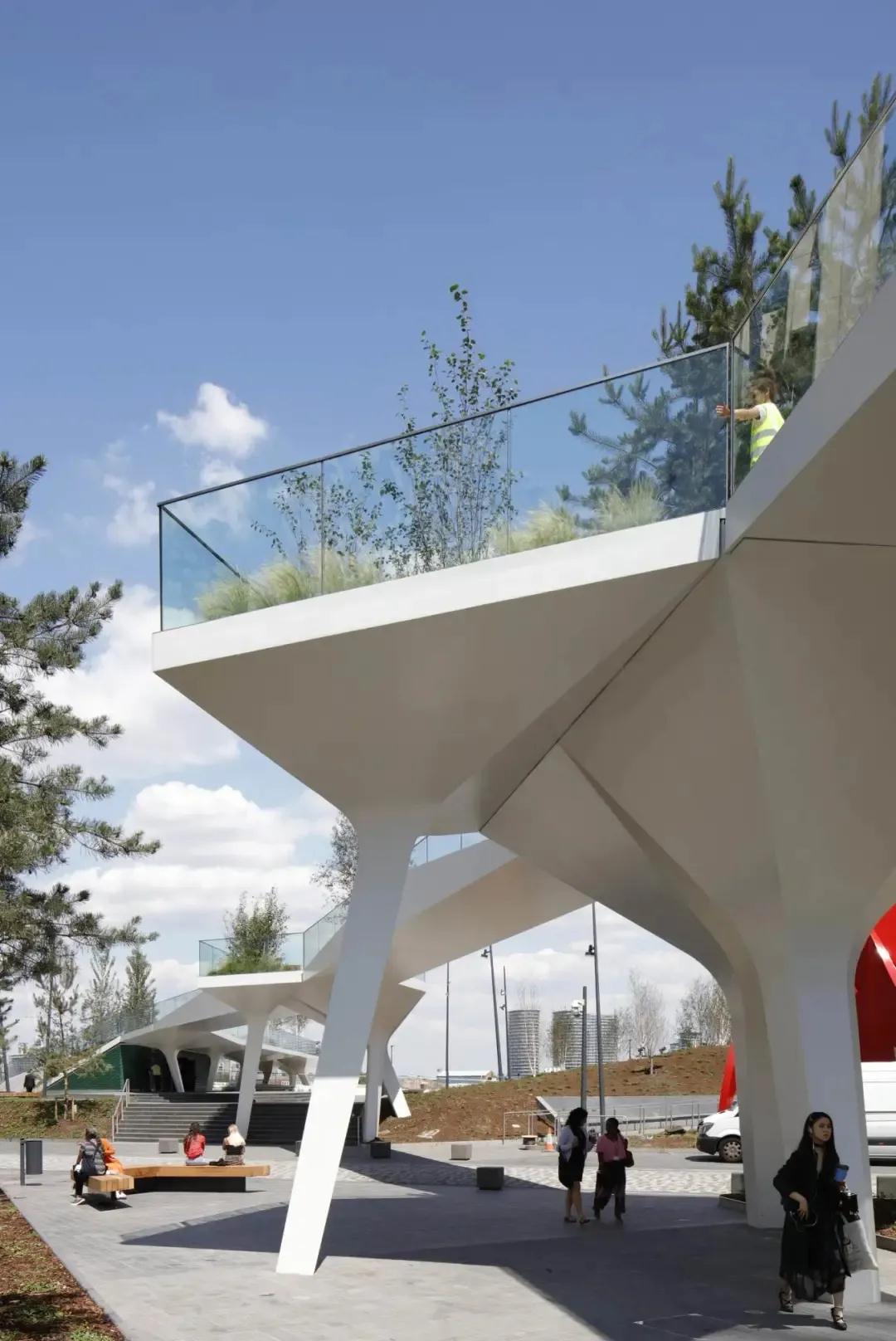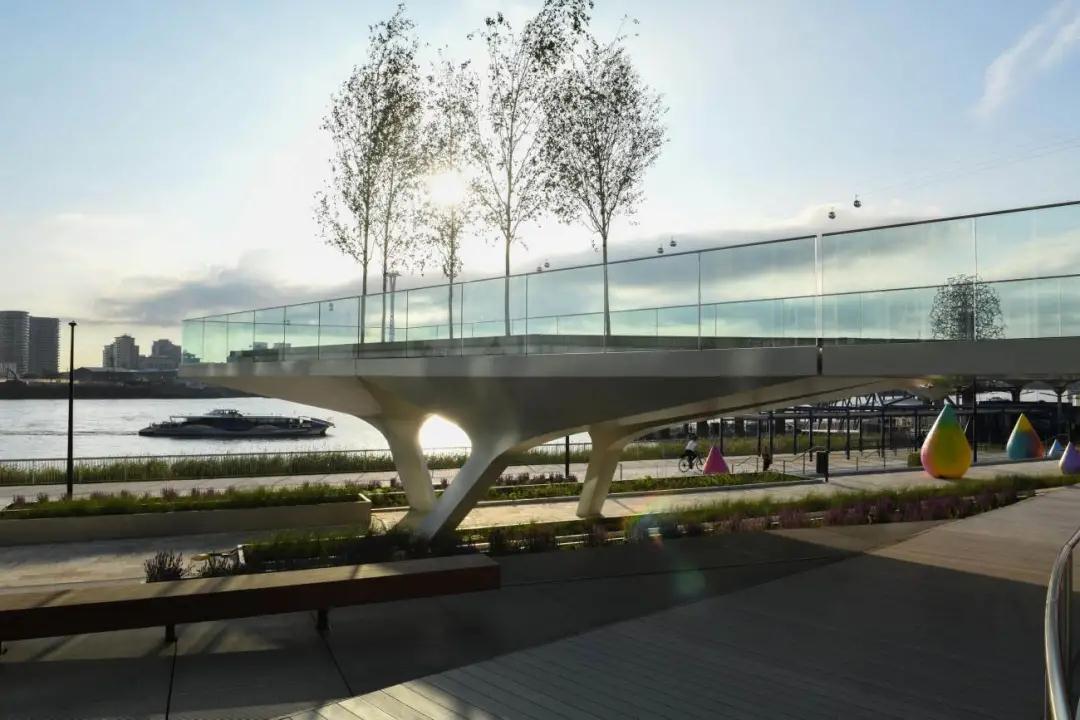 項目的第一階段是由28個(gè)獨特的結構支撐組成的。它們聚集在一起,形成類(lèi)似三腳架的結構,支撐著(zhù)上面的高架花園和人行道,同時(shí)在廣場(chǎng)上創(chuàng )造出遮蔽和反射照明的雨篷。照明、配電、數據和景觀(guān)(植被、土壤、供水和排水)系統都無(wú)縫地集成到每個(gè)結構支撐中。這些島嶼由預制的鋼橋連接,形成一條連續的2.4米寬的道路,跨度可達26米。每個(gè)支架和橋梁都由焊接的鋼板內肋和外皮組成,形成類(lèi)似飛機機翼的結構,重量輕,對正下方的倫敦地鐵站箱體影響最小。這些定制的結構由意大利的Cimolai公司制作,通過(guò)泰晤士河從車(chē)間直接運到現場(chǎng),并在幾天內用螺栓連接起來(lái)。結構件的設計是與AKTII的特殊建筑和結構合作,使用參數化軟件,最大限度地提高材料效率,減少制造的復雜性。其結果是一個(gè)綜合的建筑和結構表達,沒(méi)有多余的覆層。