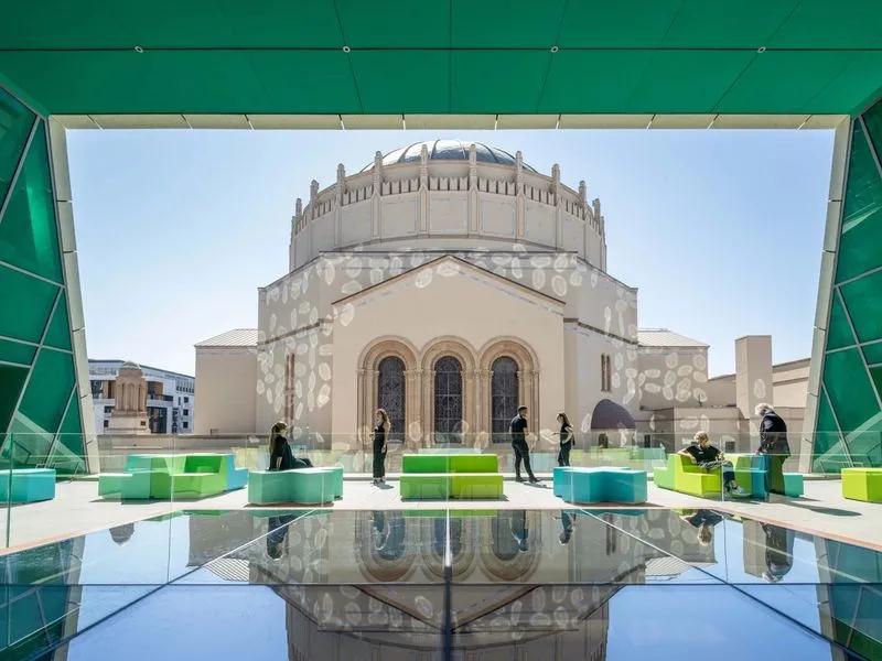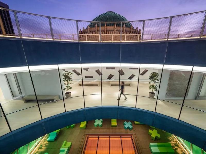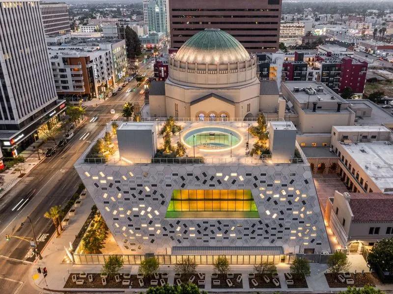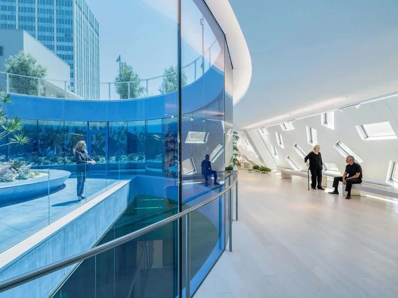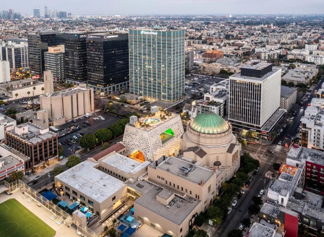 奧黛麗·伊爾瑪斯館(Audrey Irmas Pavilion)是OMA在洛杉磯一座猶太教寺廟的擴建計劃,與威爾夏大道教堂(Wilshire Boulevard Temple)主殿相鄰。場(chǎng)館的總設計由OMA事務(wù)所合伙人重松象平(Shohei Shigematsu)所帶領(lǐng),旨在為加州一個(gè)宗教機構設計一個(gè)寺廟校園,以容納不同人群集會(huì )、活動(dòng)。