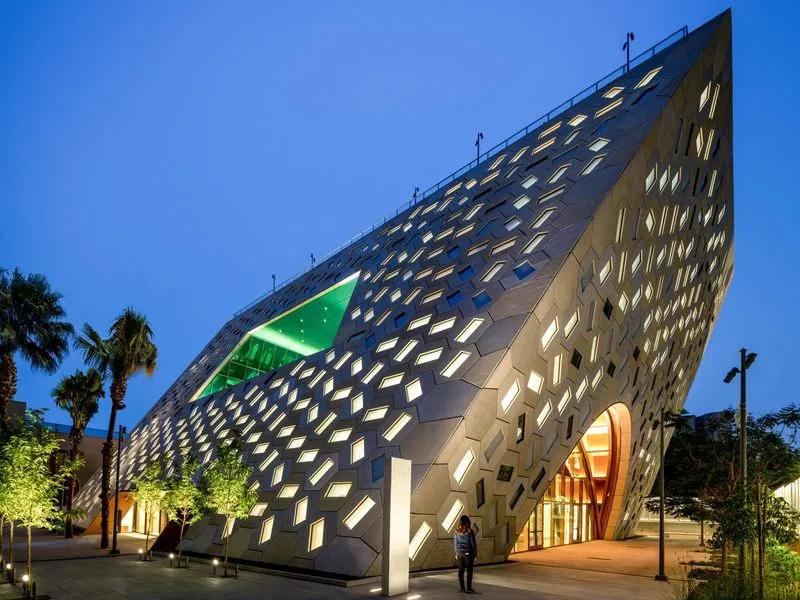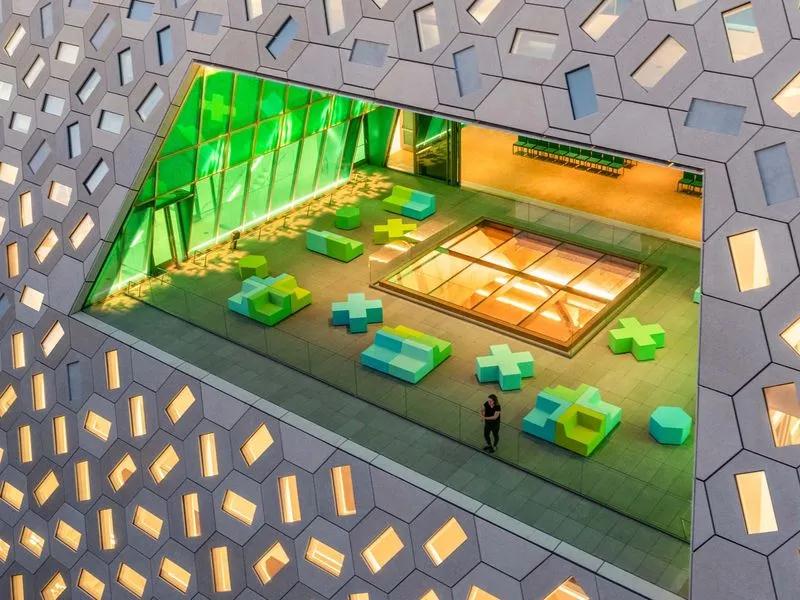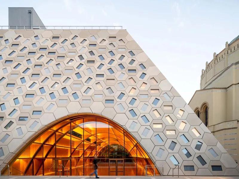 立面借鑒了寺廟圓頂內部的幾何形狀。帶有矩形窗口的單個(gè)六邊形單元被旋轉以反映其中的程序并聚合以創(chuàng )建獨特的圖案。這些面板增強了建筑的體積特征,同時(shí)增加了一種分解其質(zhì)量的人體尺度紋理。