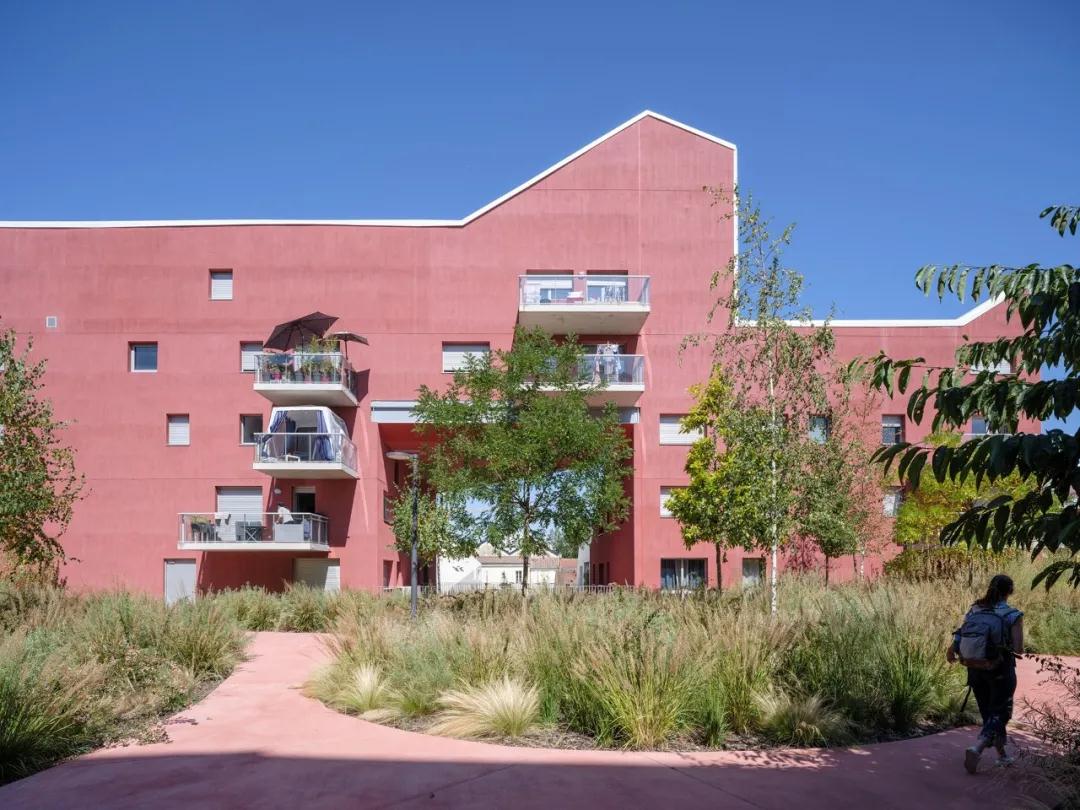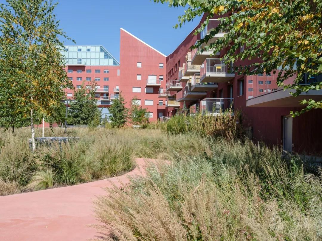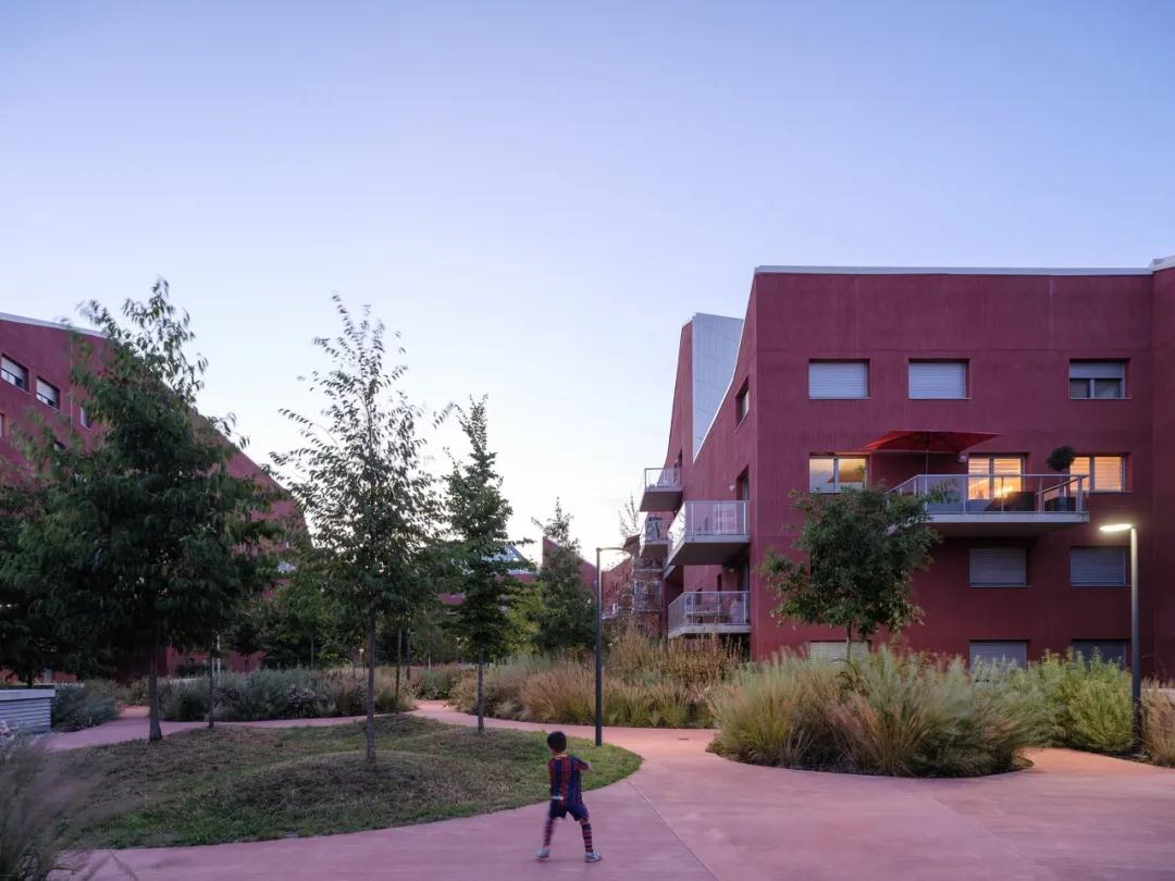 該項目的臨街立面呈現出柔和的奶油色色調,與周?chē)h(huán)境融為一體。然而,面向庭院的外墻采用亮紅色紋理灰泥完成。再加上83棵榿木、樺樹(shù)和各種草的綠色庭院景觀(guān),營(yíng)造出視覺(jué)上令人興奮的環(huán)境,與公園空間的熱鬧相得益彰。在不同的位置,穿過(guò)建筑物的大型門(mén)戶(hù)將內部庭院與外部連接起來(lái),引入閃爍的色彩,吸引路人的注意力并激發(fā)對內部空間的好奇心。
