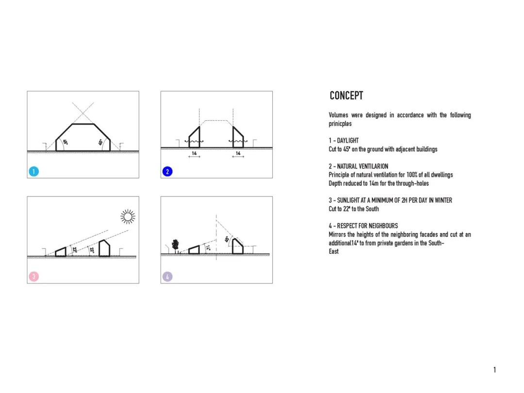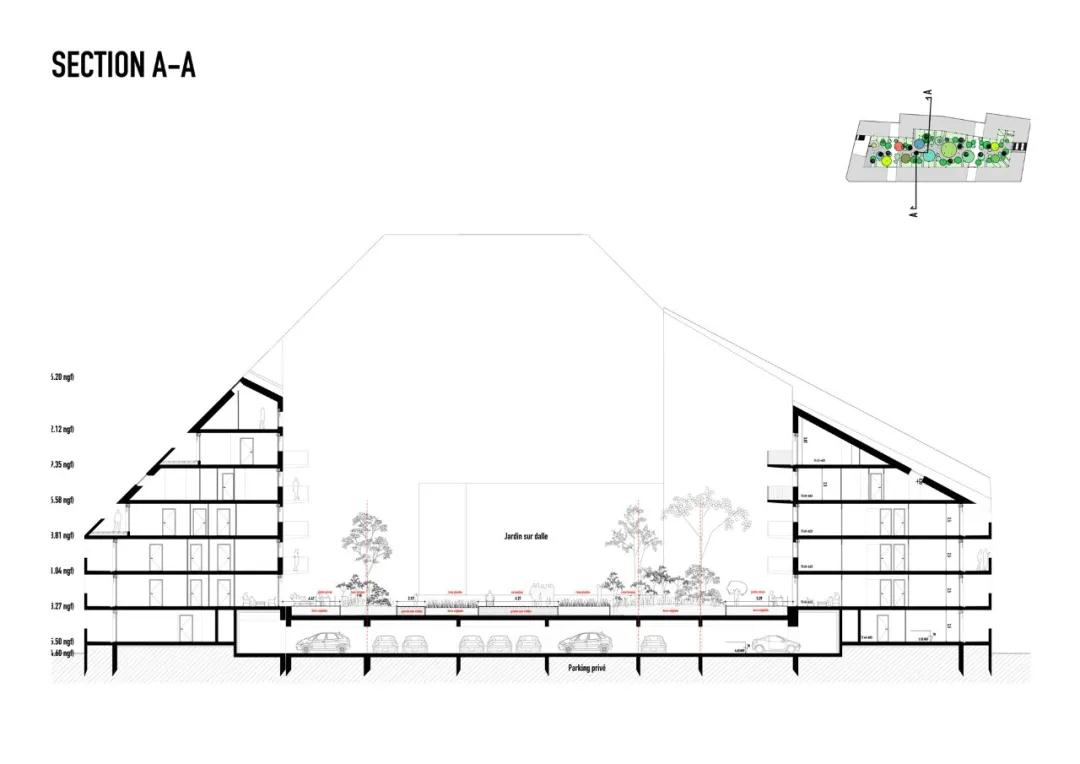 在所有方向,面向街道的立面都低于面向中央庭院的立面。根據 Bastide-Niel 總體規劃中制定的規則,屋頂坡度在 14 度到 45 度之間變化,具體取決于它們與太陽(yáng)的關(guān)系。這些斜坡創(chuàng )造了復雜而有趣的室內空間,有助于定義各種尺寸的不同公寓——使建筑成為許多不同類(lèi)型居民的家園,同時(shí)也為每個(gè)生活空間帶來(lái)獨特而溫馨的感覺(jué)。