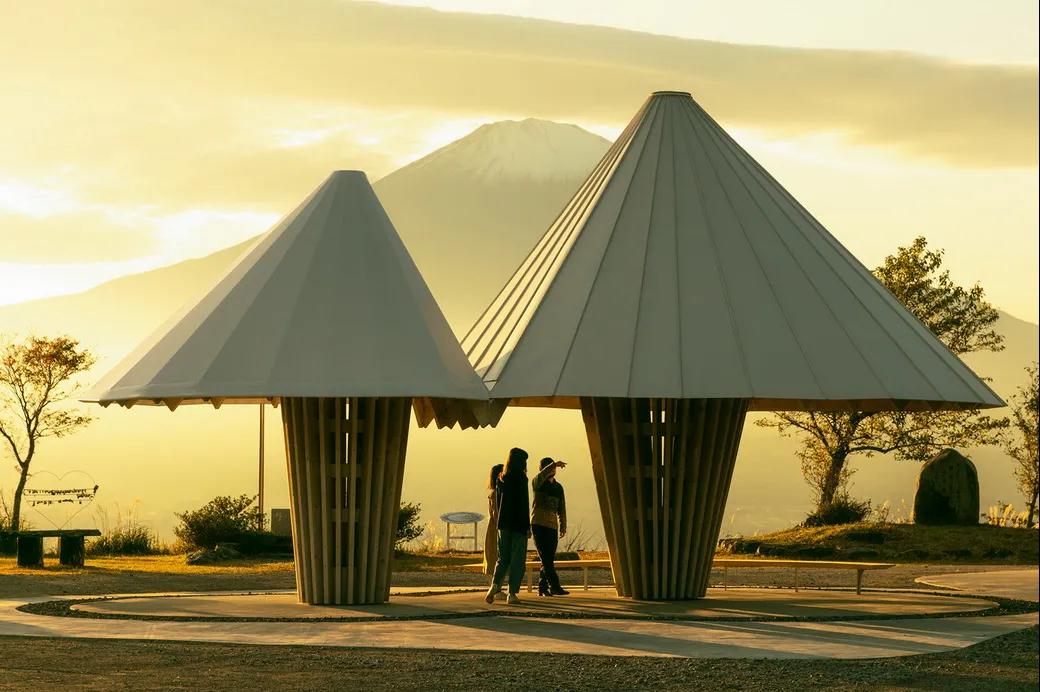 在Tenbou公園深處,知名的金太郎富士見(jiàn)徒步線(xiàn)路中段,隈研吾設計團隊打造了一座傘狀涼亭和衛生間,與富士山高聳的美麗外觀(guān)交相輝映。