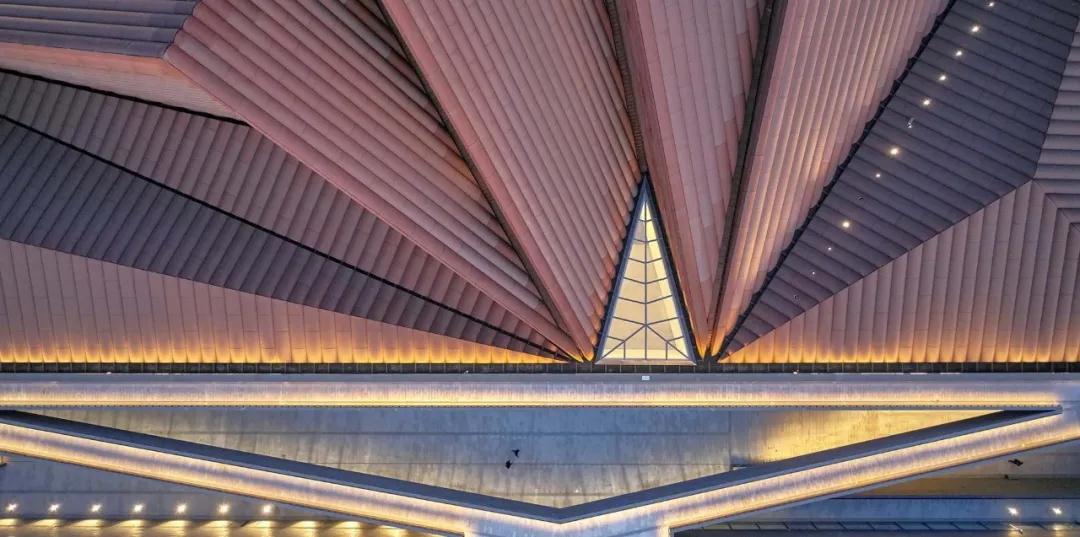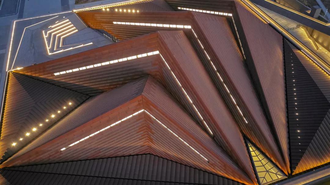 四個(gè)相互連接的屋頂金字塔高度增加,向文化廣場(chǎng)的四個(gè)角落扇形延伸。自然光通過(guò)位于每個(gè)金字塔頂端的屋頂燈進(jìn)入室內。屋頂的設計直接回應了建筑的大結構跨度,并希望創(chuàng )建一個(gè)