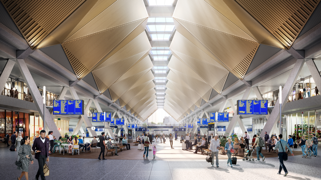 新 Euston HS2 航站樓的這些設計可容納 11 條從倫敦到中部和北部的新高速連接。其清晰的空間重振了東部現有的經(jīng)典鐵路服務(wù),包括新的倫敦地鐵售票處、更好的公共汽車(chē)和出租車(chē)站設施以及所有交通服務(wù)、騎自行車(chē)者和行人的清晰交匯處。