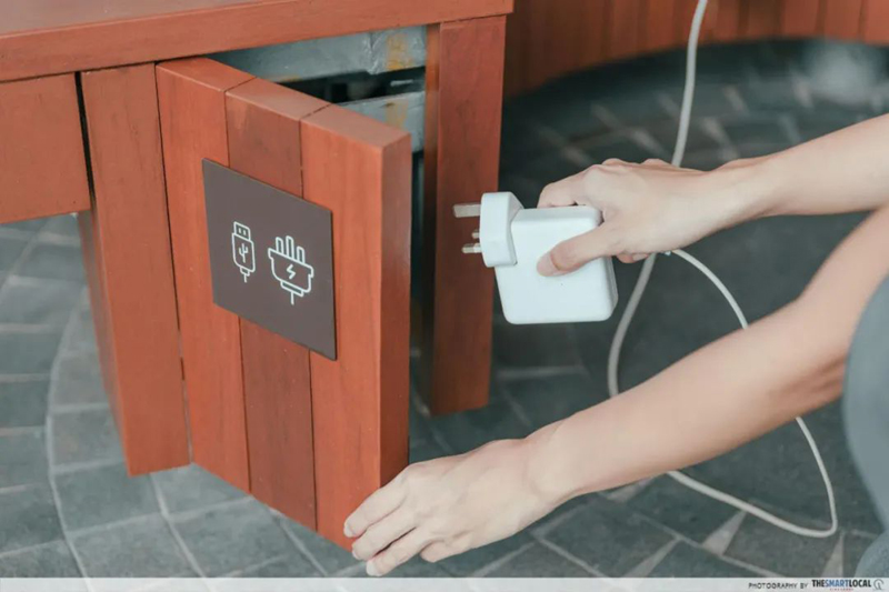 長(cháng)廊沿途有許多專(zhuān)為公眾設計的休息座椅,靠背打開(kāi)后里面有可用于手機電腦充電的插座。