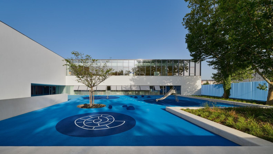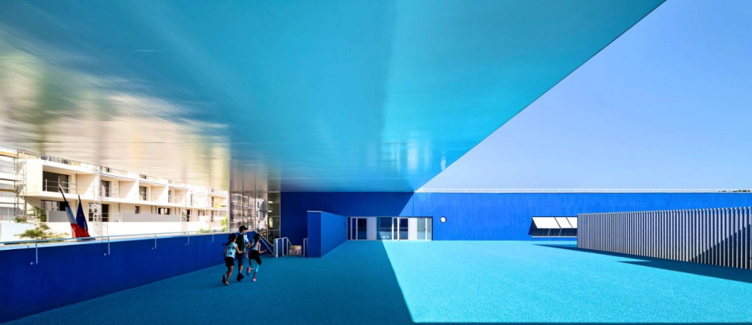 顏色可謂建筑設計中最顯而易見(jiàn)的元素,School René Beauverie猶如在與藍天白云聯(lián)系在一起,彼此和諧地達到相輔相成的效果。