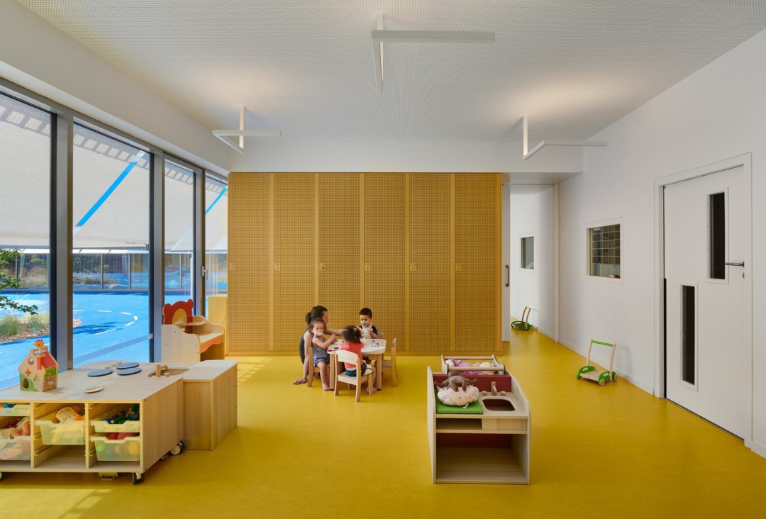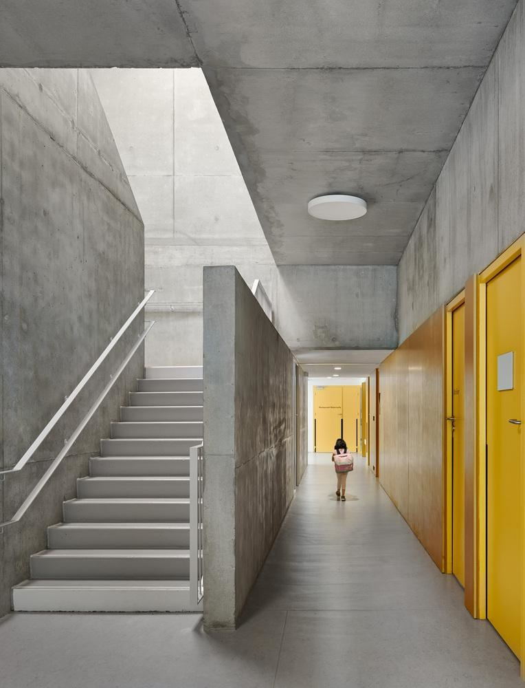 一樓的黃色區域劃分為托兒所和體育館;并以大樓梯為空間主軸,用以通往上層庭院區和小學(xué)的大樓梯。