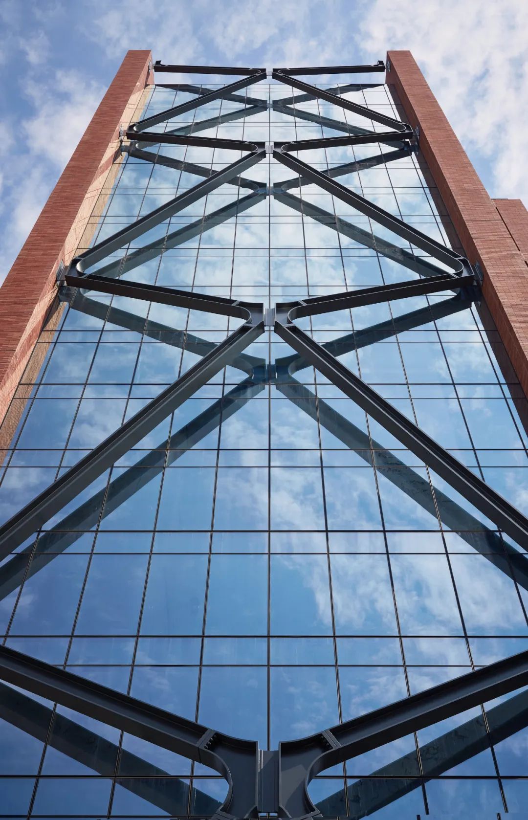 在大約 9 英寸的熱運動(dòng)的預期范圍內,支架可有效抵抗風(fēng)荷載。連同由玻璃制成的偏置懸臂式核心,這種獨特的結構系統可實(shí)現大型開(kāi)放式地板和靈活、光線(xiàn)充足的工作空間。