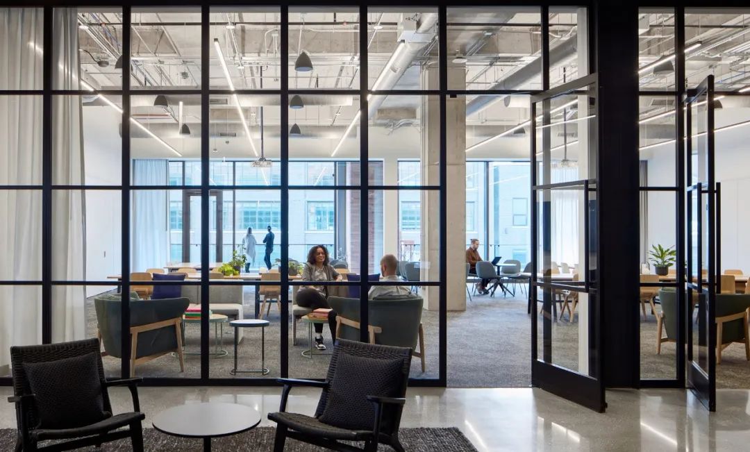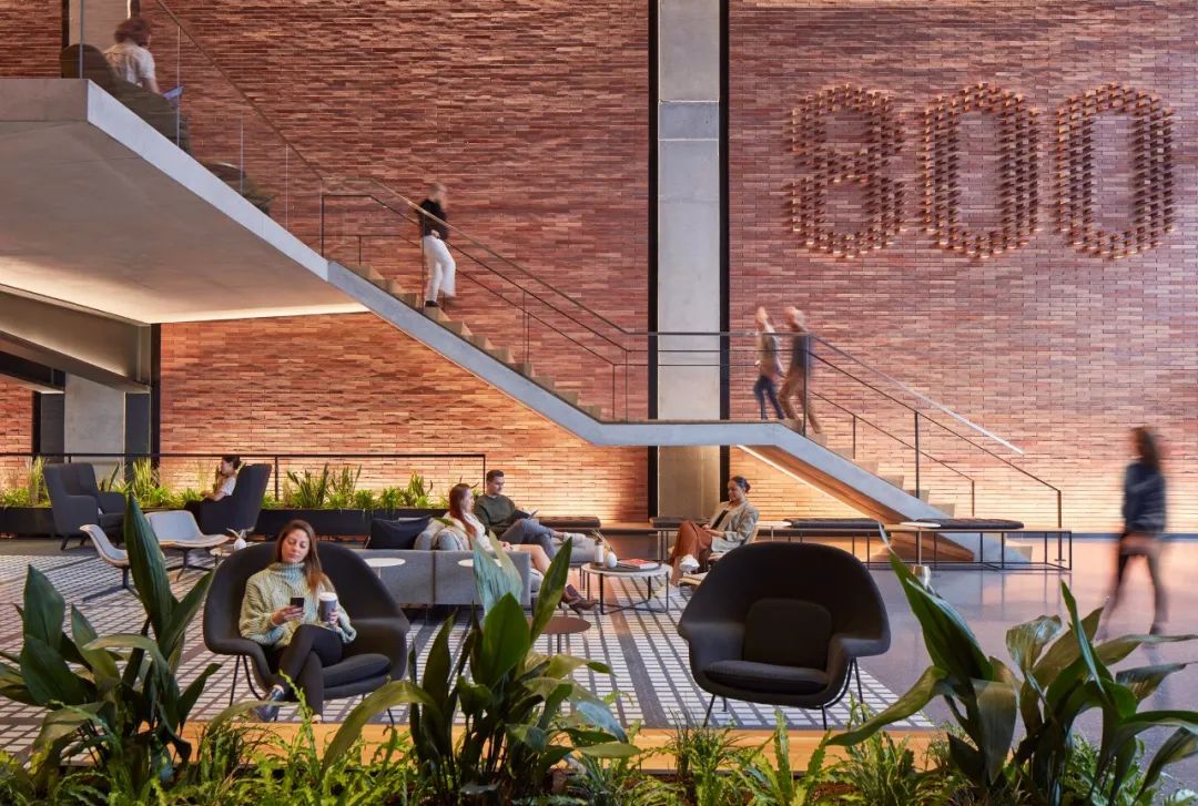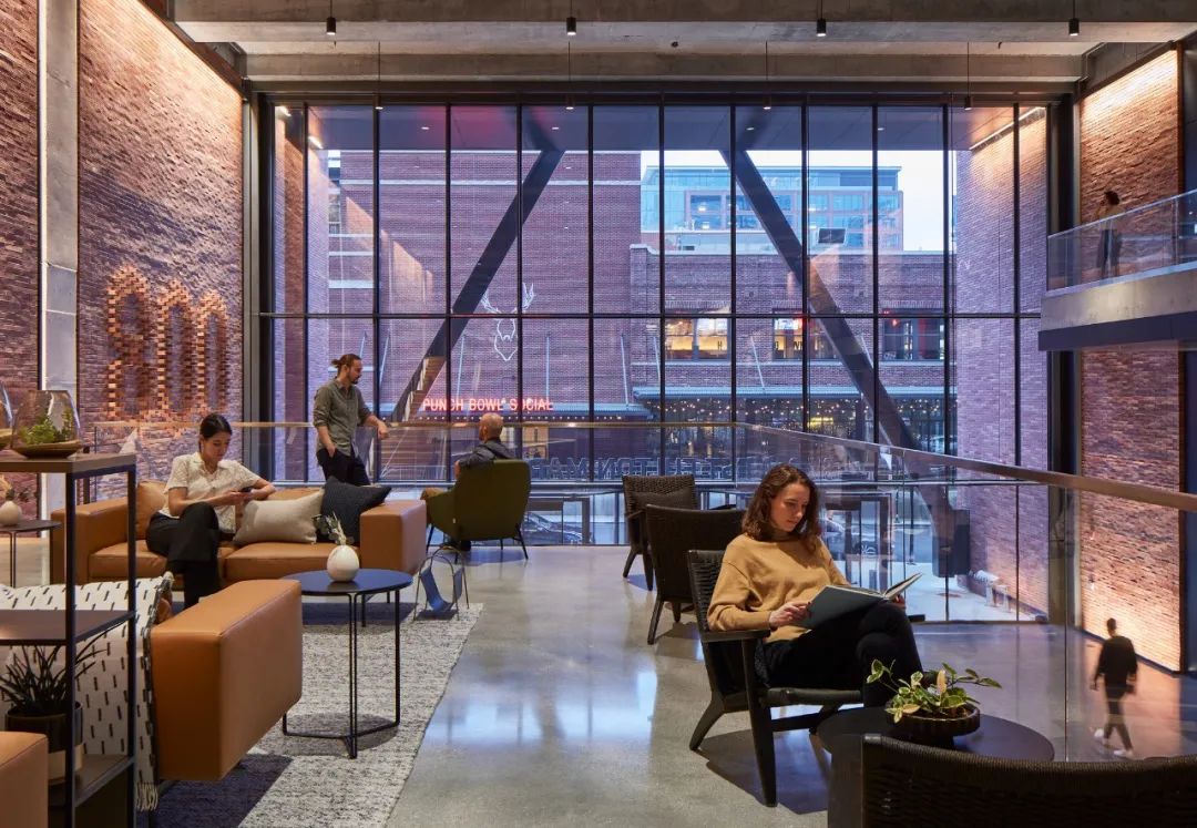 促進(jìn)健康的室內設計。在內部,一個(gè)近40英尺高的主大廳由一個(gè)懸臂樓梯和夾層定義,創(chuàng )造活動(dòng)的分層空間。材料采用了混凝土、木材和紅磚,模仿了塔樓的外觀(guān),并從附近的工業(yè)特征中汲取靈感。有了靈活的工作站和座位,大堂也成為了一個(gè)交流的場(chǎng)所,無(wú)縫地融入了繁忙的街景。