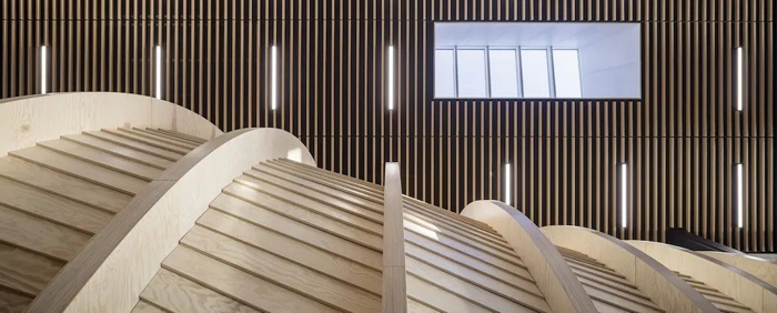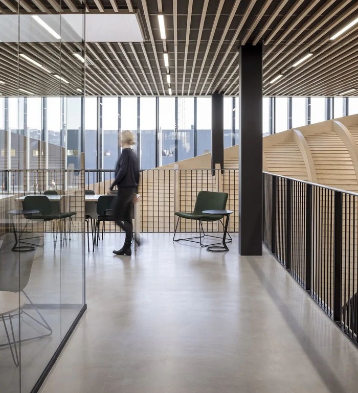 在建筑的主入口處,猶如波浪的木質(zhì)臺階,靈感來(lái)自于當地特色漁船。無(wú)論從內部還是外部,都成為員工和客人的聚焦點(diǎn)和社交場(chǎng)所。