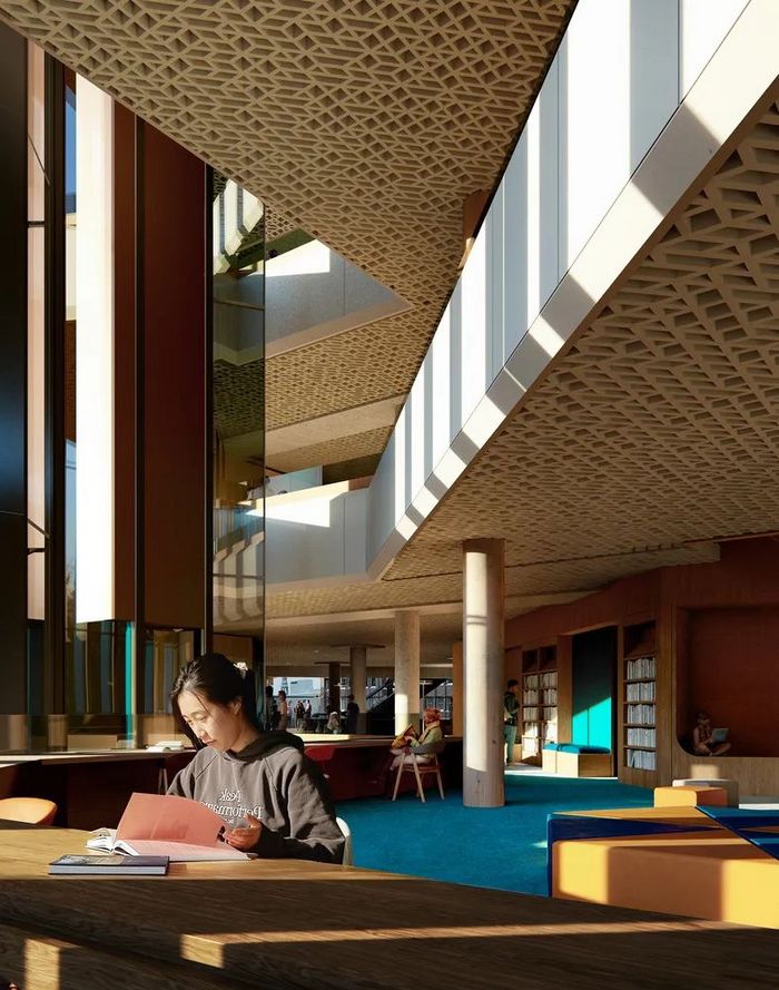 為了實(shí)現可持續發(fā)展理念,并保留城市記憶,該項目為圖書(shū)館打造了一個(gè)“城市客廳”,使其符合當代的可持續性和循環(huán)標準。設計引入了一個(gè)巨大的玻璃“瀑布”,可以展示出內部交通空間,并將光線(xiàn)引入中庭。