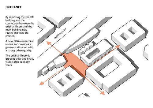 大學(xué)校園的中心為圖書(shū)館重新設計了一個(gè)全新的外觀(guān),其主要特點(diǎn)是兩層玻璃面的平臺,從最初建于1895年的歷史性閱覽室的頂部伸出來(lái)。拆除20世紀70年代建造的擴建部分后,圖書(shū)館北側的歷史性建筑外墻被揭開(kāi),現在它的前面有一個(gè)大的覆蓋區域。這對整個(gè)校園中心的城市發(fā)展所產(chǎn)生的影響,是評委會(huì )作出決定的一個(gè)主要因素。