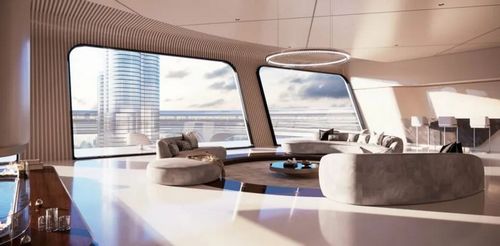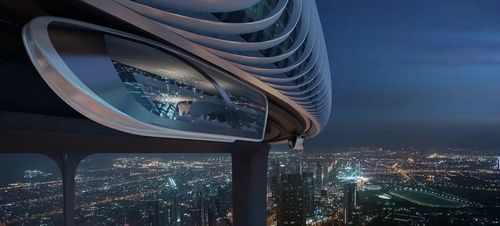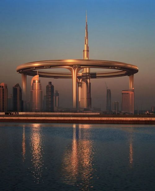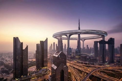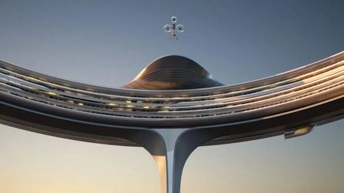 據介紹,這是一座可持續的、自給自足的環(huán)形垂直城市,高550米,周長(cháng)約為3000米,由五根巨型柱子支撐;其特點(diǎn)是圍繞世界最高樓哈利法塔(828米),建筑懸浮在迪拜市中心地面半公里以上。