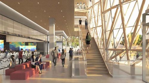 符合建筑的可持續性使命,一個(gè)高聳的木框架中庭將容納中心的社交和協(xié)作空間,飄逸的玻璃幕墻將自然光灑滿(mǎn)多層空間,還采用了大規模木質(zhì)網(wǎng)架。建筑核心的關(guān)鍵空間包括生物圈工程設施、太陽(yáng)能科學(xué)與催化中心、遙感中心、轉化科學(xué)設施、教學(xué)實(shí)驗室,以及講座和互動(dòng)學(xué)習空間。