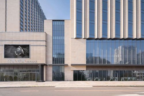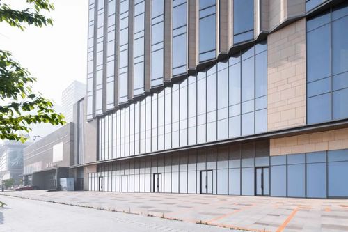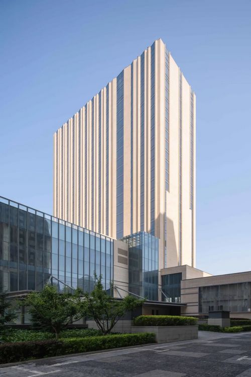 兩座塔樓和商業(yè)裙房采用一致的設計風(fēng)格,營(yíng)造出統一的視覺(jué)和諧感。外立面主要采用淺黃色石材和藍灰色玻璃,與規整的簡(jiǎn)約建筑造型相得益彰,構建出淡雅樸素的建筑形象。