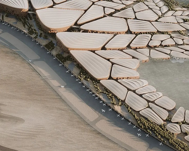 依據方案,項目臨海而建,建筑匍匐在大地上并延申至大海 。與景觀(guān)相融,使項目充滿(mǎn)了人文主義與自然氣息 。 作為沙特 NEOM 項目中不可或缺的一部分,該機場(chǎng)將在這座新城市的崛起中發(fā)揮變革性作用。