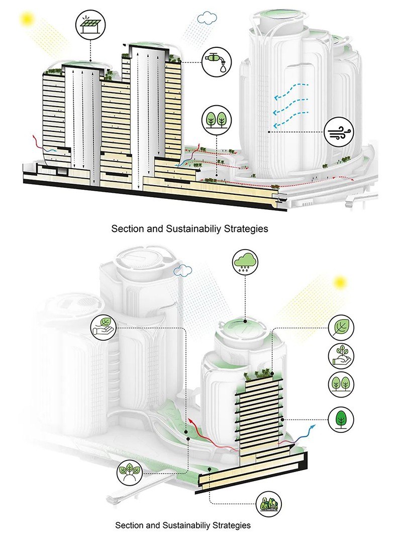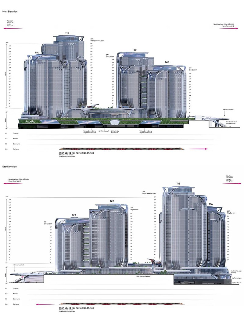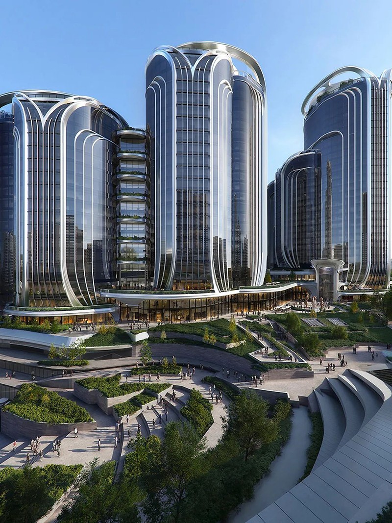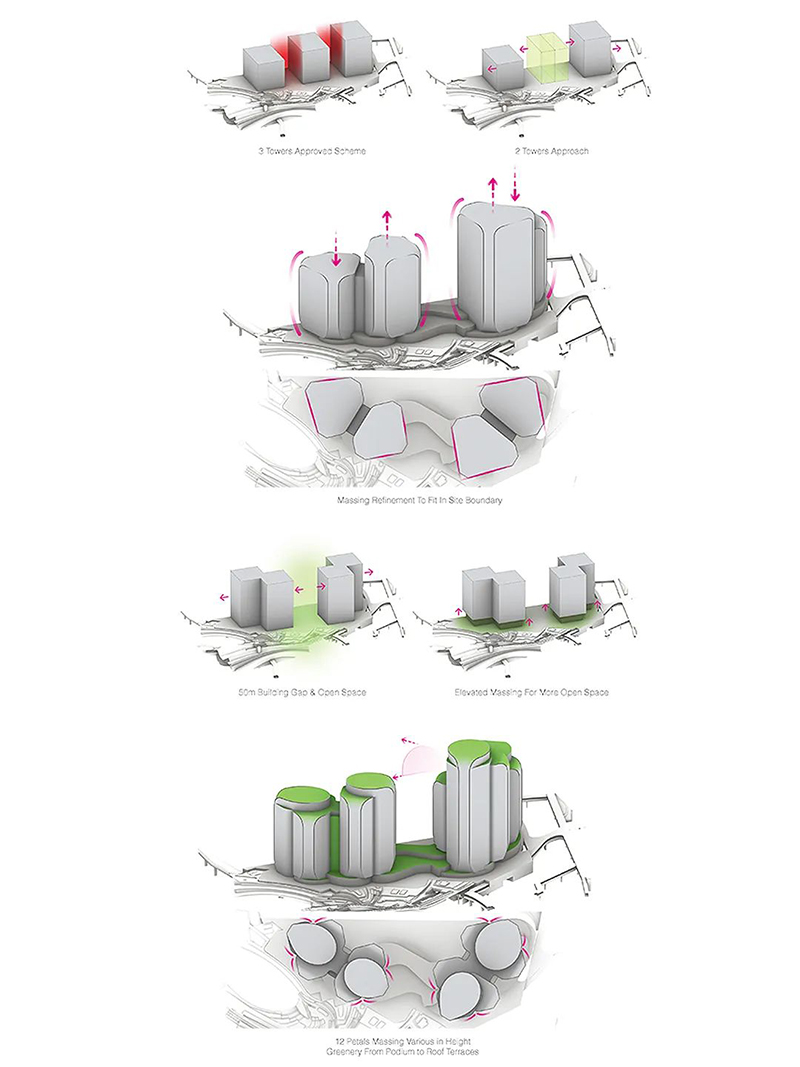 項目由扎哈·哈迪德建筑事務(wù)所設計。建筑師將塔樓分為一系列相互連接的 “花瓣”,每個(gè)花瓣的朝向和高度各不相同。塔樓間共同圍合出一個(gè)中央大廣場(chǎng),并與西九龍步行道相連,供休閑、娛樂(lè )和公共活動(dòng)之用。
